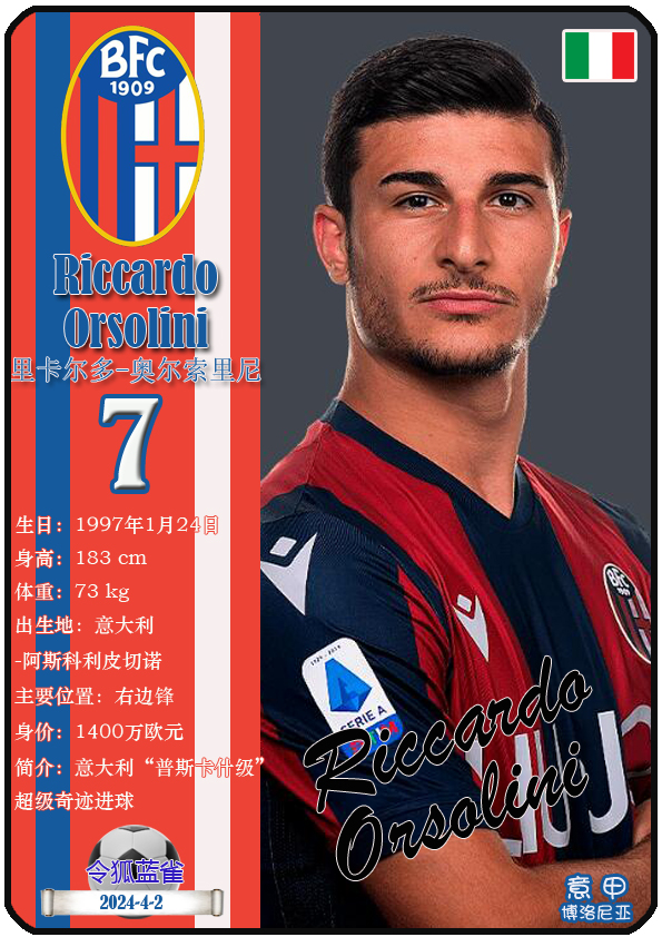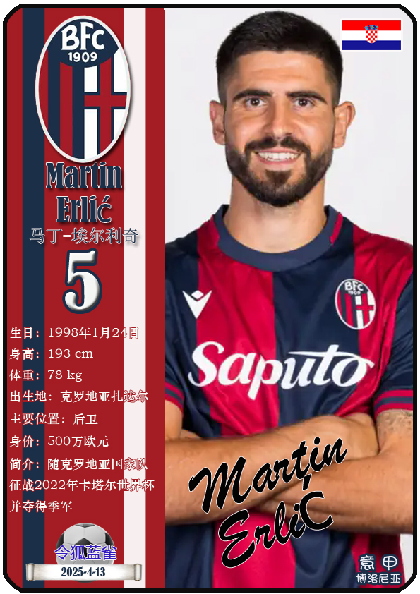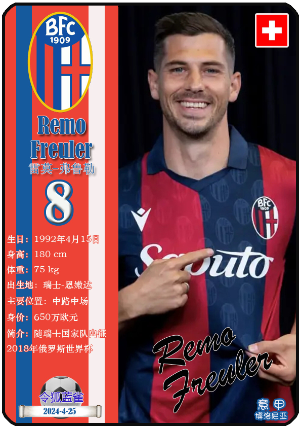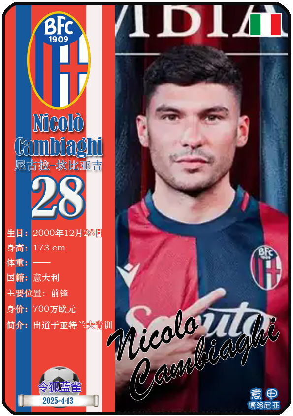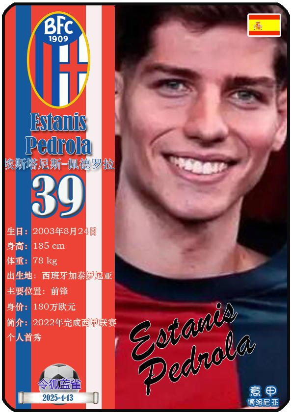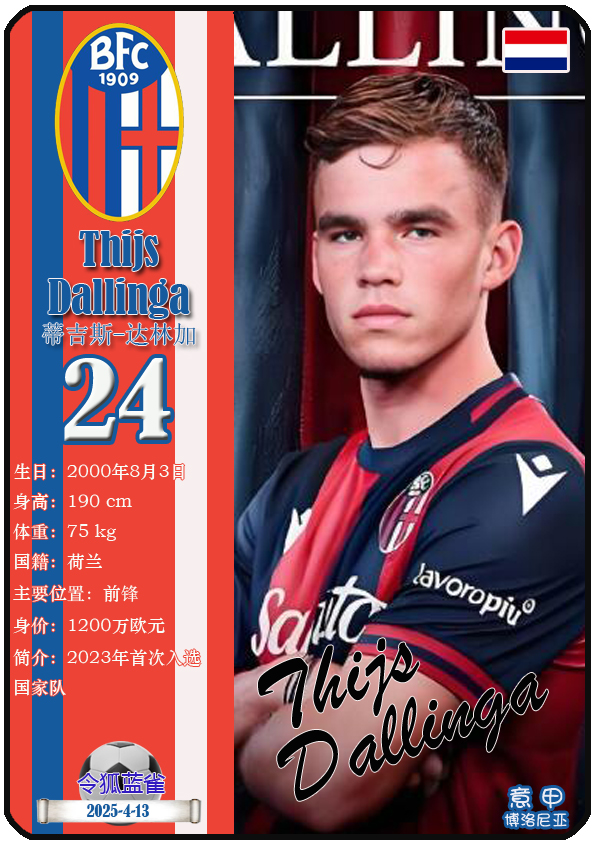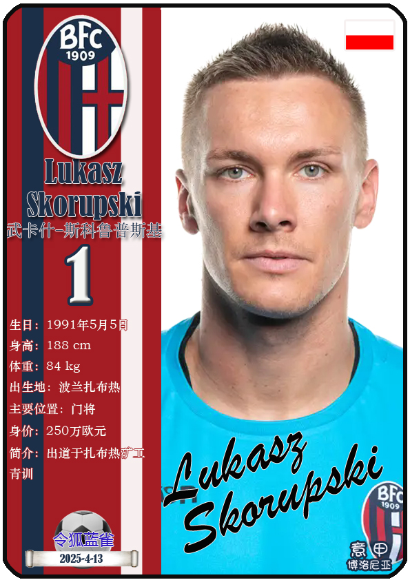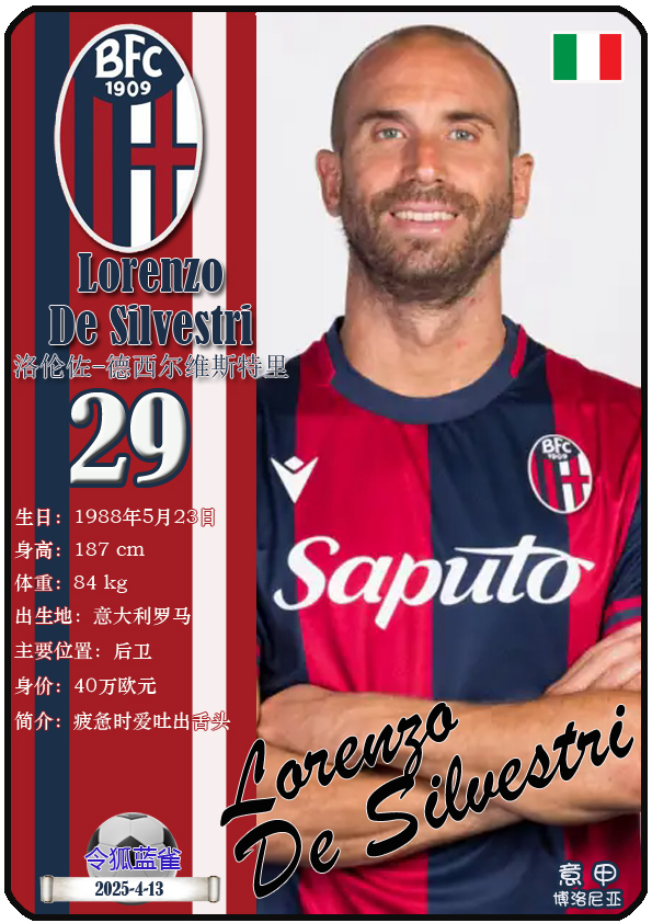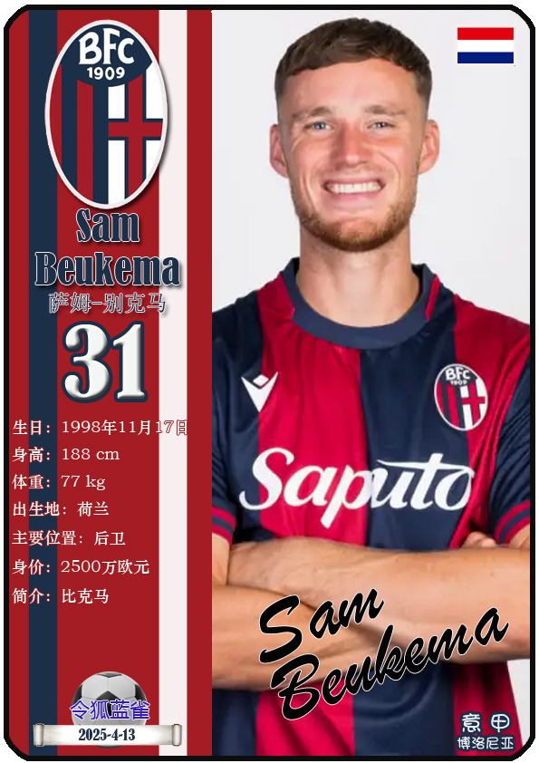 意甲博洛尼亚足球俱乐部主场是内拉托-达拉亚球场,2024/25赛季主教练是维岑佐-伊达利诺,本赛季拥有球员圣地亚哥-卡斯特罗、丹-恩多耶、萨姆-别克马等。本期以球星卡的形式展示截至2025年4月13日博洛尼亚足球俱乐部的22名球员(按球衣号码排序):