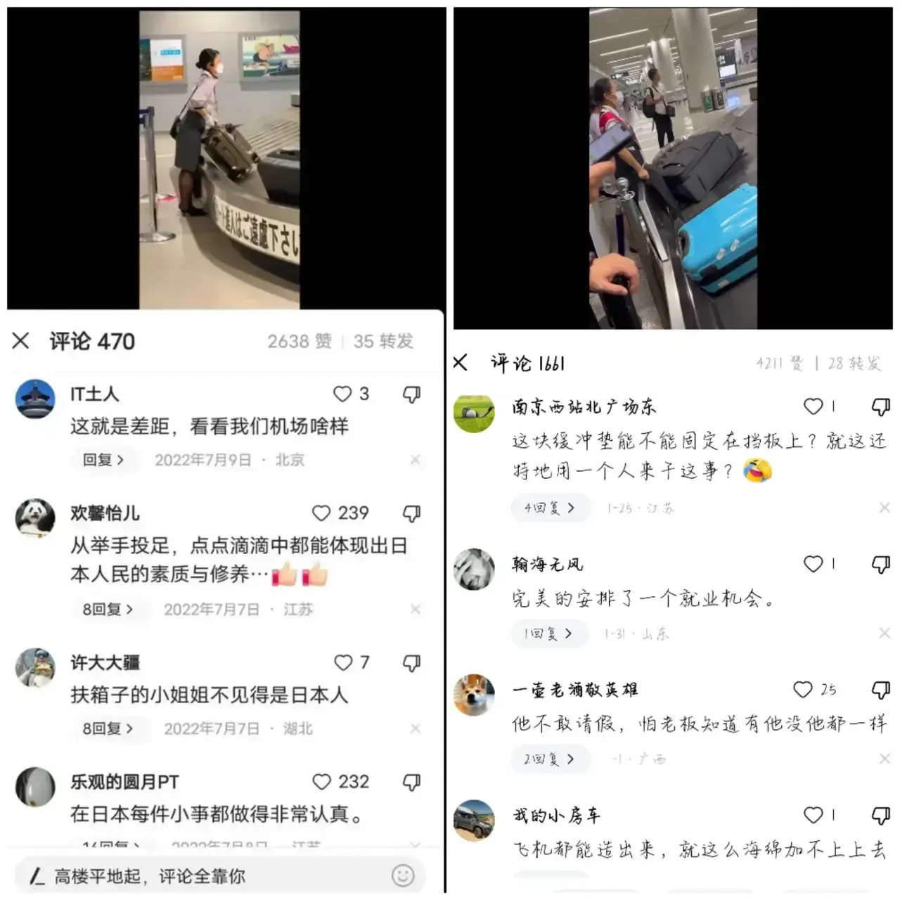 机场行李转盘,两个图都有人工在行李出口接行李,防止行李撞击转盘护栏损坏行李,图一是日本的,底下评论是:高大上,人性化,服务周到。。图二是国内的,底下评论是:没事找事,浪费钱,设计不合理。。同样的事,却有不同的评论风格