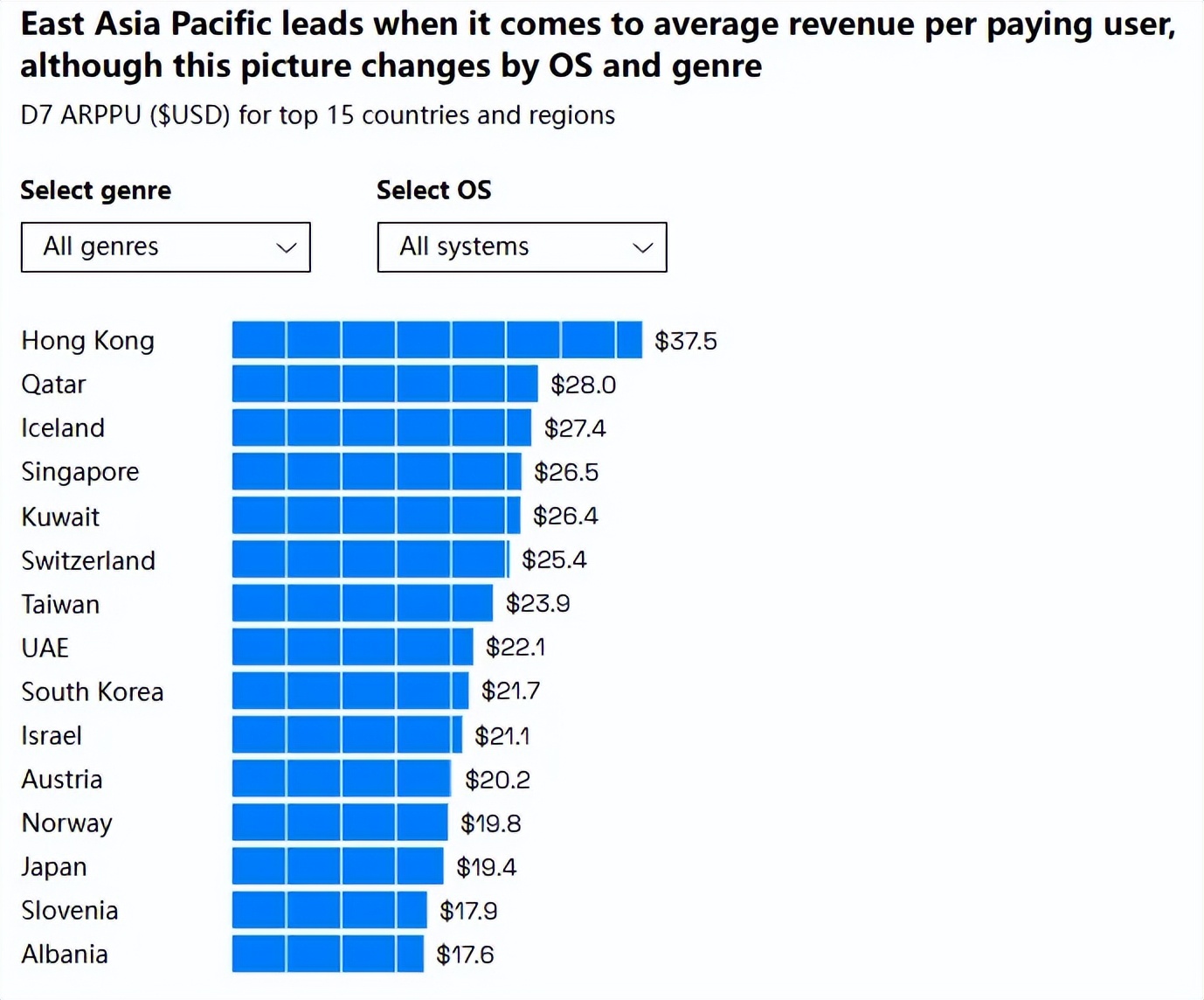 例如,与其他类型游戏相比,Match等休闲游戏的ARPPU往往较低,但纵观全球,这类游戏在美国、挪威、瑞士等国家的用户价值仍然较高。相比之下,RPG、策略游戏在日本、新加坡、韩国等地的ARPPU一直处于高位。