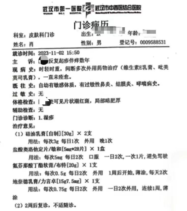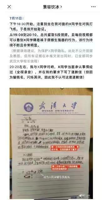 武大性骚扰事件男方发声:不是打飞机,是隔裤抓痒 2月4日,之前武大性骚扰事件的涉事男主的母亲,首次公开进行了发声。这一次男主肖先生的母亲肖母告诉我们,他当时并没有性骚扰,更不是女方说的在打飞机,并且晒出了证据。 事情是这样的,2023年10月11日。一位武汉大学的女学生,网名《景容饮冰》发帖《关于我在武汉大学图书馆受到性骚扰这件事情》。这位女学生就告诉我们,她在图书馆看书的时候,被一个男生给性骚扰了。并且那个男生还隔着裤子对她“打飞机”。 这件事上热搜之后,网友们都站在了这个女生这边。然后武汉大学得知之后,也是给了肖先生一个记过处分。但因为那个女生曝光了肖先生的个人信息,导致他被人网暴了。被网暴之后,肖先生就得了抑郁症。 所以现在肖先生的母亲就站出来为儿子发声了,想要和大家澄清这件事情。这次肖母就告诉我们,事情并不是大家想的那样。她的儿子是得了特应性皮炎,表现是湿疹。所以那个时候肖先生并不是在打飞机,而是在抓痒。 肖母还晒出了门诊病历,并且记者也找医生确认了,确实那个时候肖先生是患有皮炎,皮炎位置也符合。至于道歉信一事,那是肖先生为了息事宁人才写的。他自己当时都是懵的,不知道怎么就被人说是性骚扰了。 从肖母晒出的病历也能看到,肖先生现在被网暴的有抑郁症了,出现了“急性应激反应”。根据资料显示,出现这种反应的人有很大概率会去自杀。所以我也是觉得,这件事也都过去那么久了, 大家没必要再去网暴别人了,这是违法的行为。 当然我也是觉得,一个能考上武汉大学的优等生,真不会说有脸在大庭广众下干出那种事情。应该也确实是皮炎导致自己痒的受不了,才隔着裤子去抓的。反正这要换做是我,我是真没脸干这种事。
