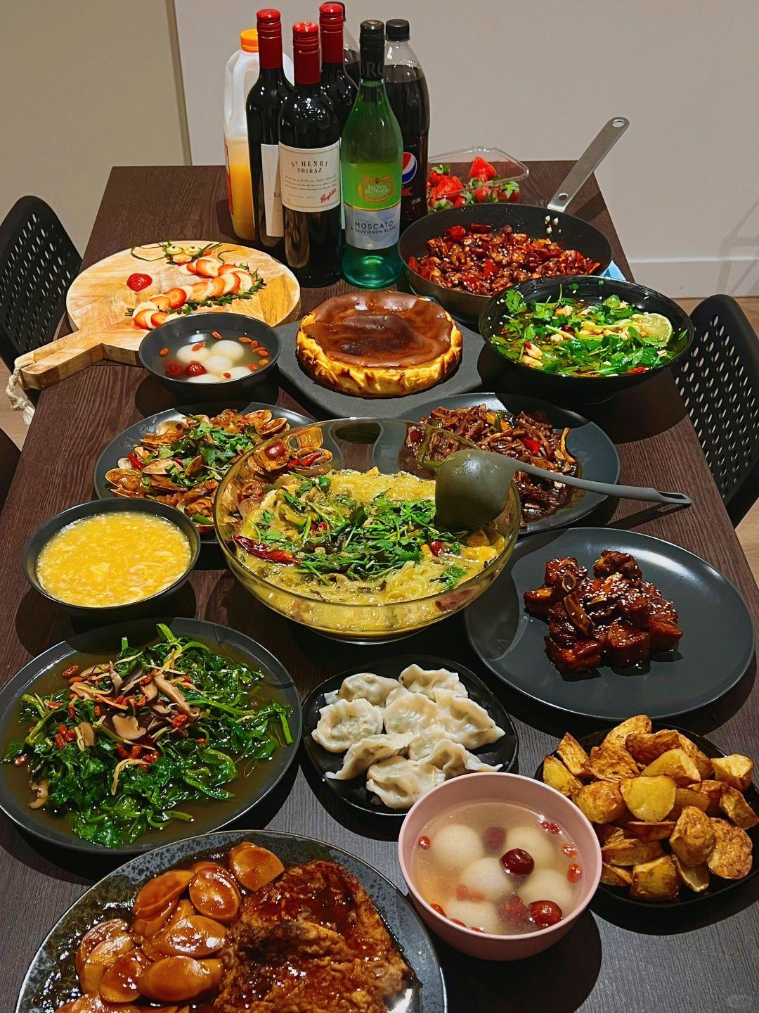几个人张罗了一大桌子菜 左边右边一起画了条龙🐉