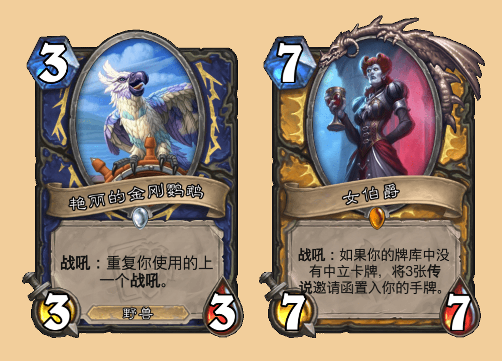 另外萨满的艳丽金刚鹦鹉也可以复制其他职业的战吼效果了,清风看了一下,其他职业的战吼那真是千奇百怪,甚至还可以触发调皮的小鬼的战吼,复制两个鹦鹉,不过大家都是3/3的身材,似乎没啥区别,清风觉得最有意思的combo还是配合女伯爵,再拿三张邀请函。不过竞技场里如果能选到女伯爵还能触发,本身就已经很猛了……当然以上只是清风自己的脑洞,大家也可以在评论区聊聊你还想到了哪些跨职业combo。