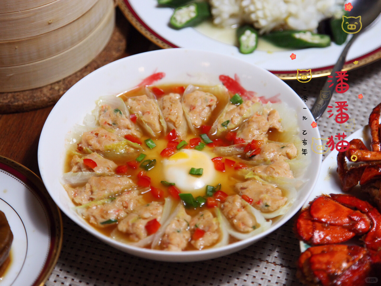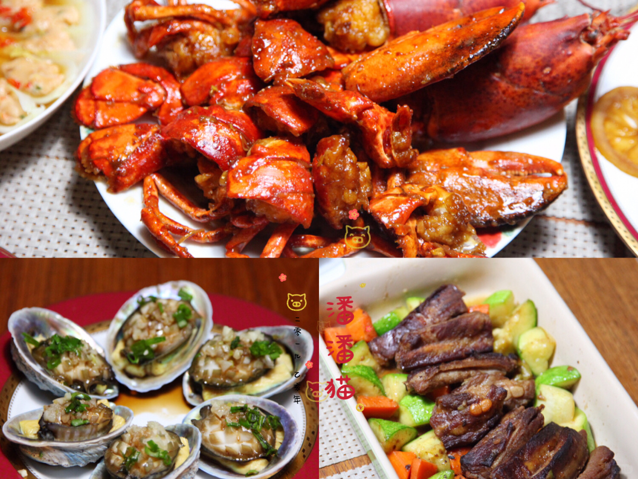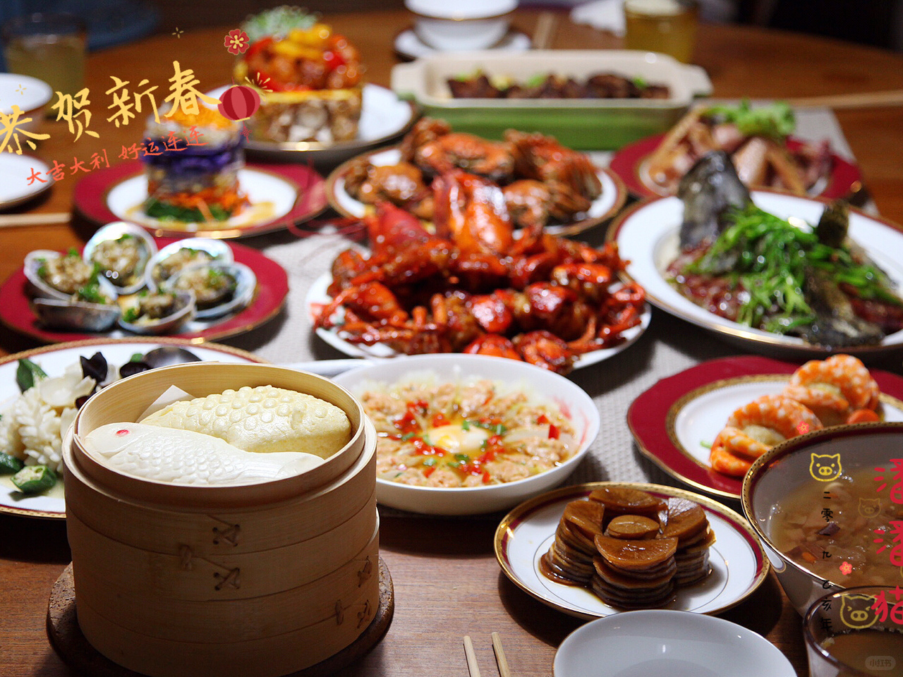 新年好,祝大家新年快乐,健康如意,锦鲤常相伴,潘潘家二零一九己亥年年夜饭 冷盘:玫瑰花雕醉蟹 灯笼虾 什锦海蜇 开胃萝卜 热菜:手撕风干鸡 菠萝咕咾肉 花开富贵虾 蒜香翡翠鲍鱼 秋葵炒鱿鱼 什蔬嫩烤肋排 葱香腊味蒸石斑 XO酱爆龙虾 主食:年年有鱼花馍馍 大年三十的饺子 汤:杏仁银耳羹 饮品:柠檬百香果蜂蜜饮