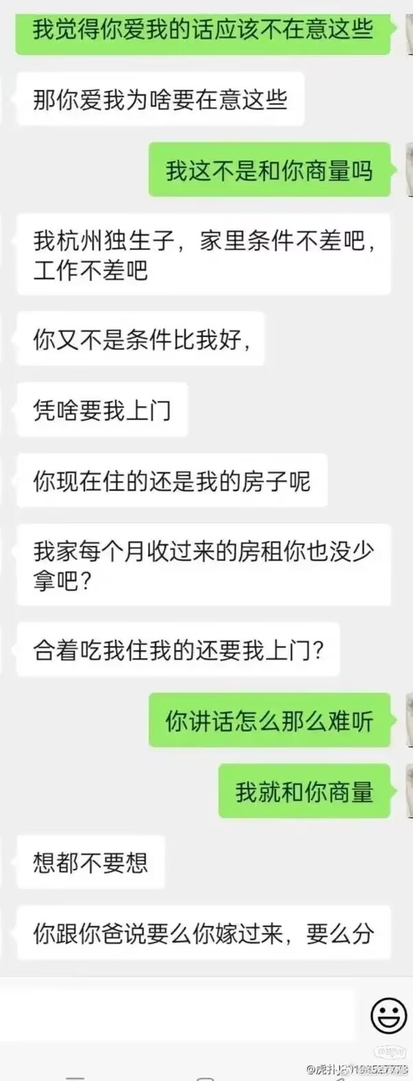 湖州女友想让杭州土著公务员男朋友入赘被怒怼,女方认为自己年薪30万且颜值高,比男方年薪20万普通颜值条件要好,就想听从老爸的意见拉男方上门入赘,结果被独生子的男朋友坚决拒绝,最后她把双方条件都摆出来让网友出主意,怎样才能说服男朋友入赘。 最后的结果是网友集体嘲讽这个女生不知天高地厚,大家看看双方这条件要求入赘合理吗