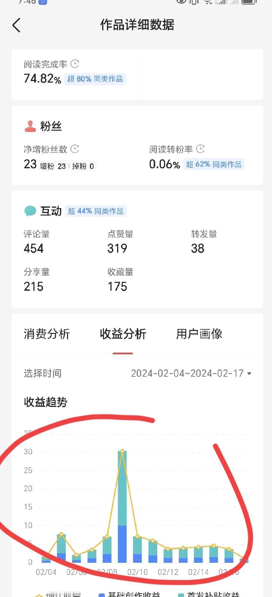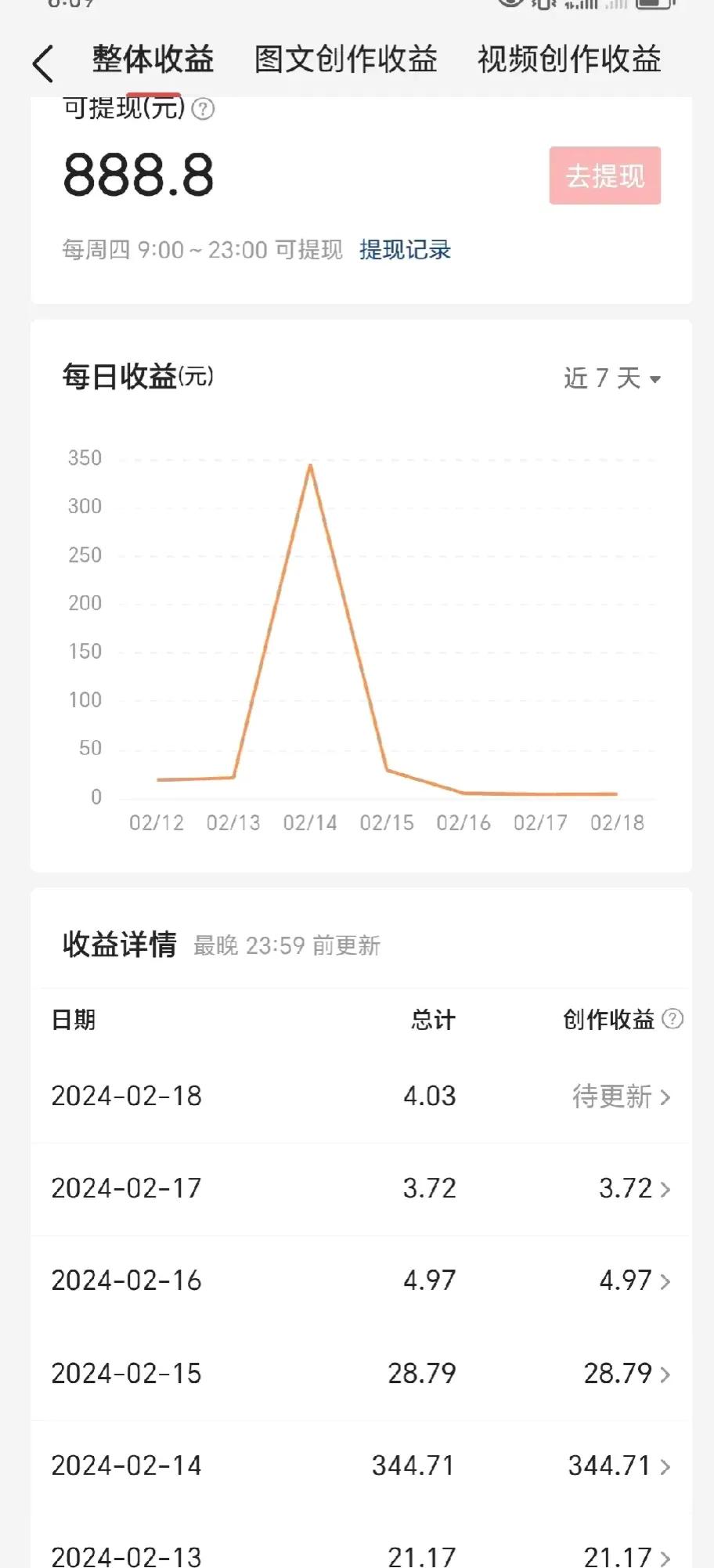 2月截止到18号平均一天40块钱左右,这还得源于前几天有个大爆款! 坚持还是有点成效的,比最开始几毛要进步很大了! 不过,奉劝大家可以写写文章,虽然文章要求字数,勾选原创需要300字以上,但是文章的收益是一直有的,大家可以看我置顶的文章,每天都有几块的收益!那篇文章写了能有两个多月了! 不积跬步,无以成千里! 只要坚持,从中找到兴趣点,挖掘真理 真的能发现闪光的一面 只要定个小目标 超越自己 那就是最棒的 #记录我的2024#