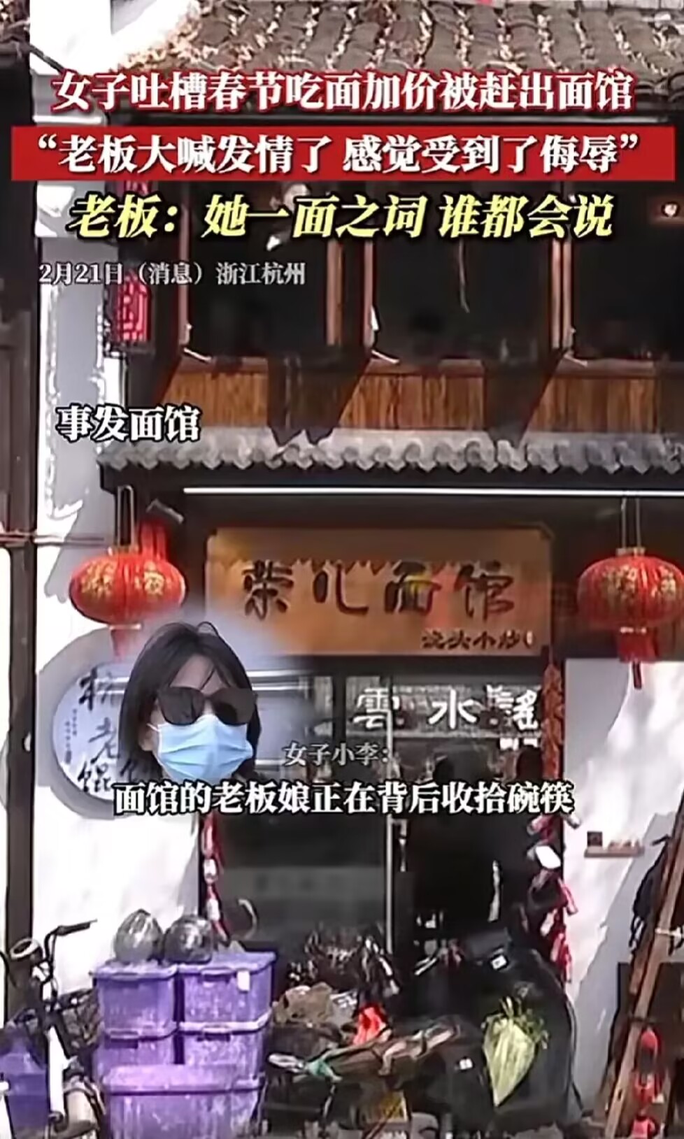 2月21日,浙江杭州。女子吐槽春节吃面加价,和朋友吐槽被赶出面馆。老板大喊:发情了!感觉受到了侮辱。老板表示她一面之词,谁都会说。