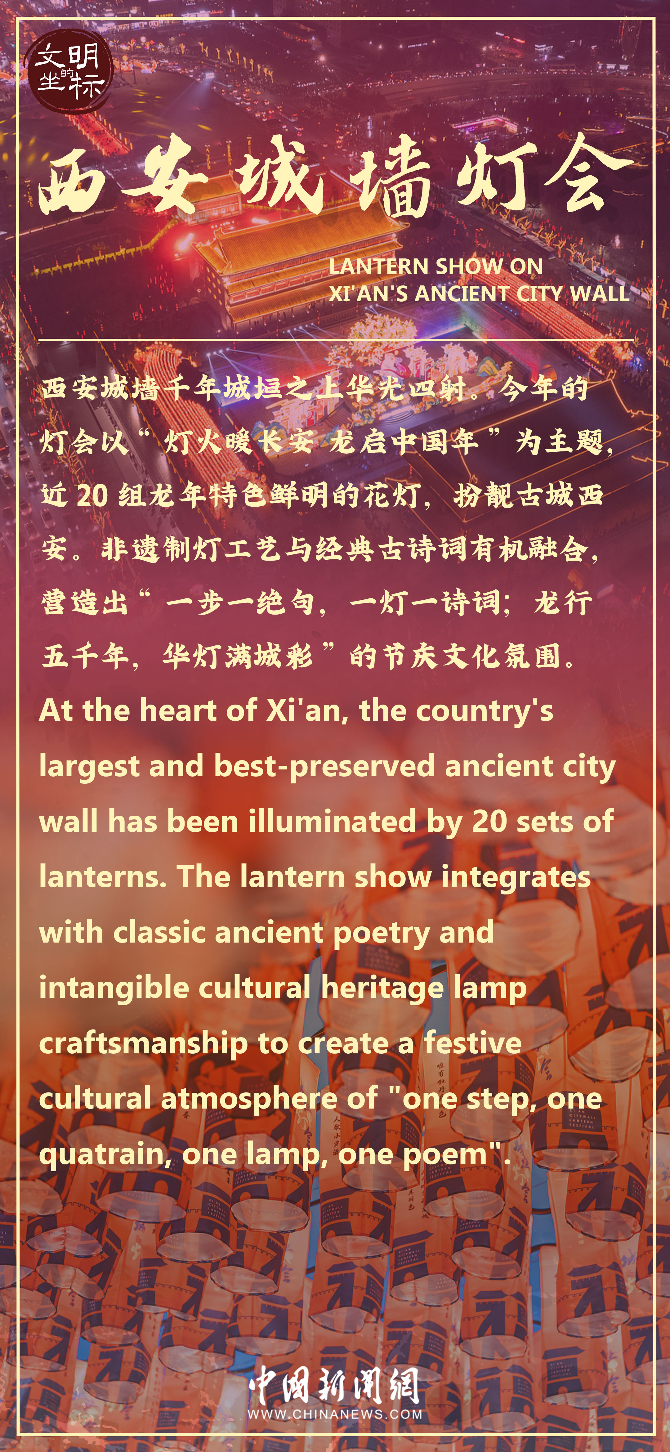 十三朝古都西安流光溢彩,迎来了一年中灯火最为璀璨的时刻。元宵节,亦称上元节,是一年中的第一个月圆之夜。自隋、唐、宋以来,元宵节观灯、赏灯一直盛行。西安城墙新春灯会自1984年首次举办,已历经40年,今年的灯会以“灯火暖长安龙启中国年”为主题,近20组龙年特色鲜明的花灯扮靓古城西安。灯光照耀下,历史与现实交相辉映,古都西安绽放出独特的魅力。在熙熙攘攘的人流中,在灯火辉煌的画境里,一同跨越千年,灯如昼,夜未眠。