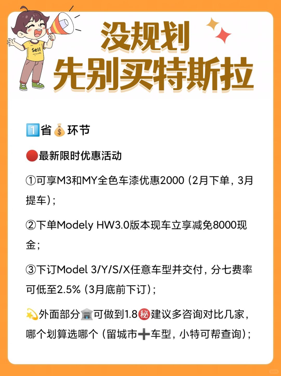 ①可享M3和MY全色车漆优惠2000(2月下单,3月提车);