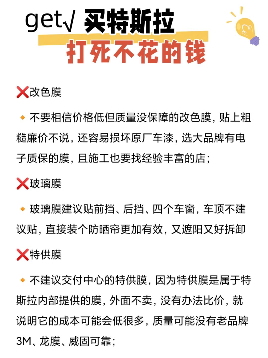 🔸不建议交付中心的特供膜,因为特供膜是属于特斯拉内部提供的膜,外面不卖,没有办法比价,就说明它的成本可能会低很多,质量可能没有老品牌3M、龙膜、威固可靠;