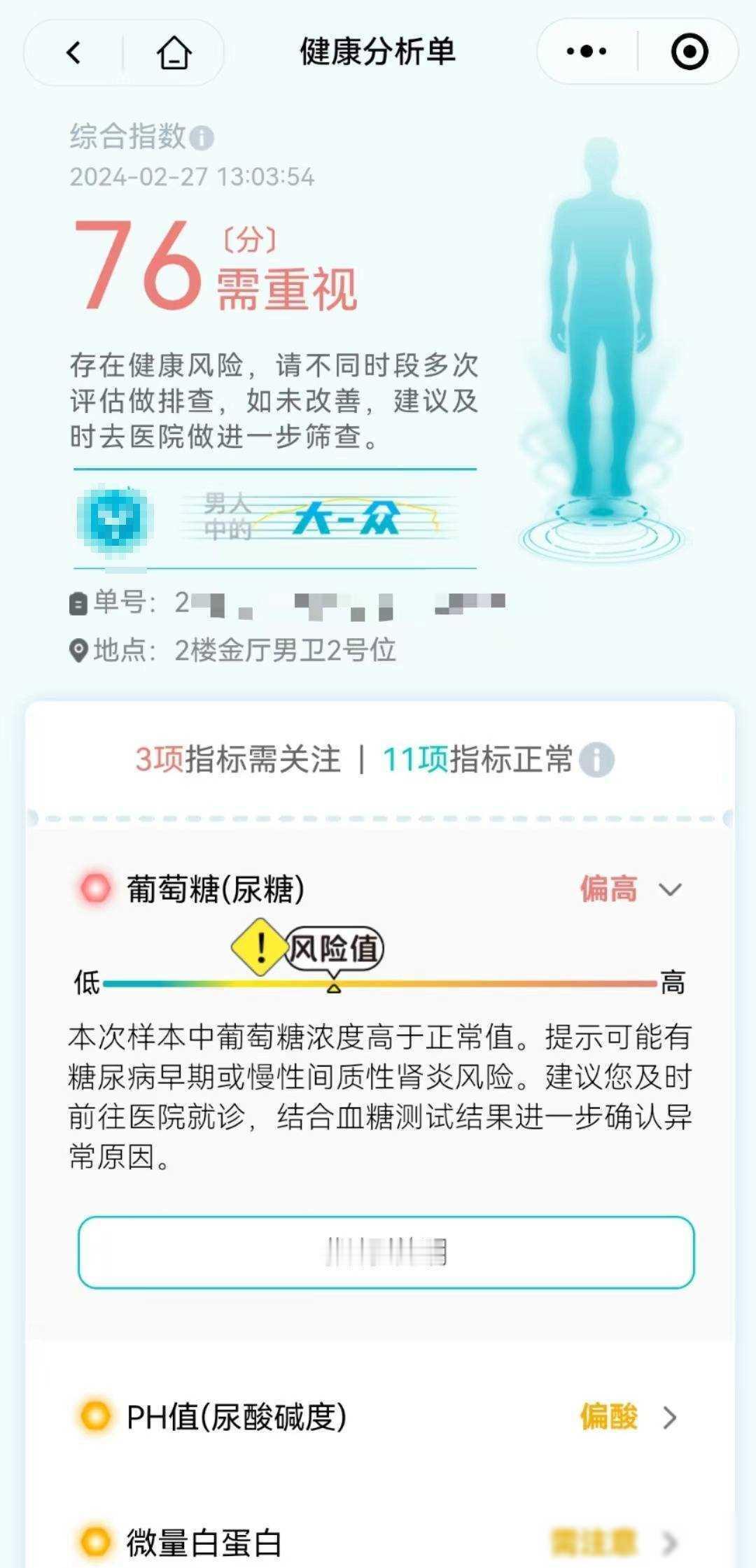 长沙一商场男厕小便池“健康检测”靠谱吗?晨意帮忙记者实地验证 我亲自实地测试了长沙一商场男厕所的“健康检测小便池”,对其功能和准确性进行了验证。这样的便利设施给了市民们一个新的选择,但其检测结果的可靠性备受质疑。 在这个快节奏的社会里,人们对健康的关注越来越高,因此出现了各种各样的健康管理产品和服务。而这种“健康检测小便池”无疑是一个新鲜事物,它的出现让人们对自身健康状况有了更直观的了解。然而,对于其检测结果的准确性,仍然存在一定的疑虑。 我在商场男厕所里亲自体验了这一产品。通过简单的操作,我得到了自己的尿液检测报告。然而,我也不能完全依赖这个报告来判断自己的健康状况,因为在医学上,对于一些疾病的诊断需要更加专业和全面的检查。 事实上,这种“健康检测小便池”的检测结果仅能作为健康管理数据的参考,不能作为诊断依据。因此,如果我们真的关心自己的健康,还是需要定期进行专业的体检,及时发现和解决潜在的健康问题。 总的来说,这种新型的健康管理设备给我们提供了一种便捷的健康检测方式,但其可靠性还有待进一步验证和提高。对于我们普通人来说,保持健康的生活方式,定期进行健康体检才是最重要的。