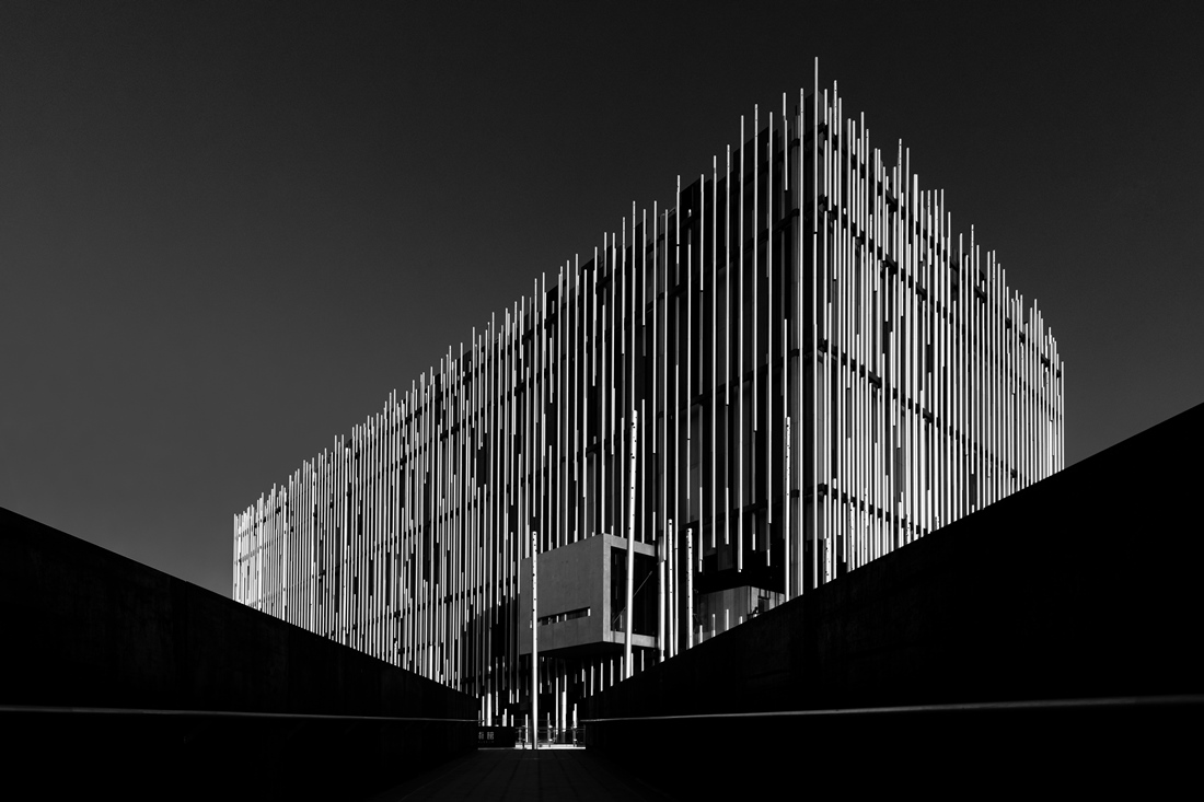 不同于常见的极简建筑摄影,这幅作品没有选择光线充足的时间段,而是用大片的黑暗去凸显纹理细节和建筑层次,这也是非常契合黑白摄影的特点。