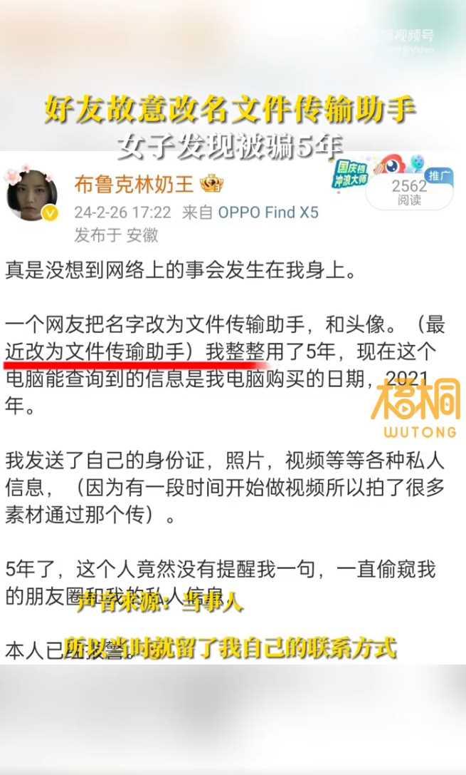 好友将女子名字改成“文件传瑜助手”骗5年,已报警并联系微信客服,却未获解决 最近听说了一则颇为震惊的社交噩耗,发生在安徽合肥的一位女子身上。故事的开端是因为她在微信上使用了一个所谓的“文件传瑜助手”,但直到5年后,她才发现这一切都是一个巨大的欺骗。 这位女子刚刚踏入职场,对微信的使用并不熟悉。为了方便工作,她在微信上搜索了一个文件传输助手,选择了其中一个,从此开始了长达5年的使用。然而,最近的一次使用中,她惊讶地发现这个助手的名字已经被改成了“文件传瑜助手”。 这简直像是一个荒诞的笑话,但事实却是这位女子使用了这个名为“文件传瑜助手”的工具整整5年之久。而更令人震惊的是,她发现这个好友不仅仅是单纯地改了名字,还曾经在不知情的情况下观察了她的生活。这种侵犯个人隐私的行为让人不寒而栗。 回想起自己在职场上的种种经历,也让我深感现代社交媒体的复杂性。我们在虚拟世界中建立起的关系,有时会比我们面对面的交往更加脆弱。这不仅是一次简单的改名行为,更是对人际信任和社交底线的一次践踏。 这起事件不仅在个体层面引起了震动,也引发了对社交媒体安全性的深刻拷问。在我们享受数字化带来便利的同时,也需要更加警觉和谨慎。我们在虚拟空间中分享的信息,很可能被他人用于不可告人的目的。 报道中提到,当事人已经报警并联系了微信客服,但目前仍未有实质性的处理结果。这让人不禁思考,我们在数字社会中的权益和隐私是否得到了足够的保障,相关的法律和制度是否能够跟上技术发展的步伐。 在这个信息爆炸的时代,我们更需要提高辨别能力,学会保护自己的隐私。同时,社交平台和相关法规也亟需加强对用户信息的保护,以确保每一个网络公民都能在虚拟世界中感到安全和受保护。这或许是对数字时代伦理的一次思考和警示。