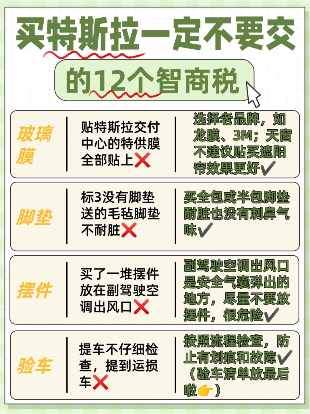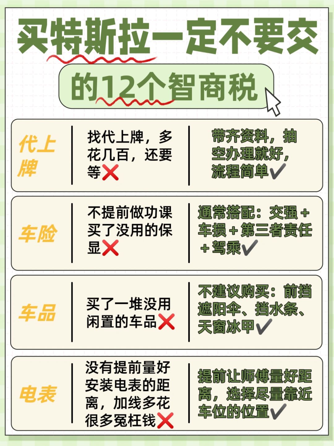 第一次买特斯拉坚决不花的钱 这些都是智商税‼️ 赶紧🐴住👇👇👇 - ✅订车 ❌不知道专属渠道试驾订车有优惠; ✔️从专属订车渠道,有500京东卡优惠; - ✅充电桩 ❌直接选guan方充电桩,6k-8k,肉疼; ✔️带国标的充电桩都可以,3k+就能搞定; - ✅城市补贴 ❌买车前不了解、查询城市补贴,损失大几千; ✔️买车前了解当地或周边城市有没有补贴,立省大几千 - ✅分七 ❌直接在店内办; ✔️现在很多大行做到1.8,多选择对比几家,哪个划算选哪个,轻松省下一大笔; - ……
