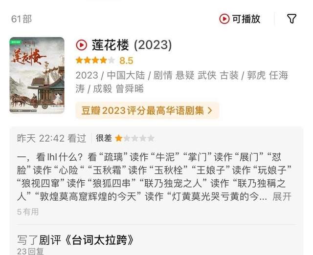 首先是成毅的《莲花楼》这部电视剧,里面清一色涌入了一片一星的恶意差评,全都是说成毅演技差的,而且都是在22后,那天正好是肖战和成毅粉丝开撕的第一天,这个节点开始黑《莲花楼》,其目的就不言而喻了。