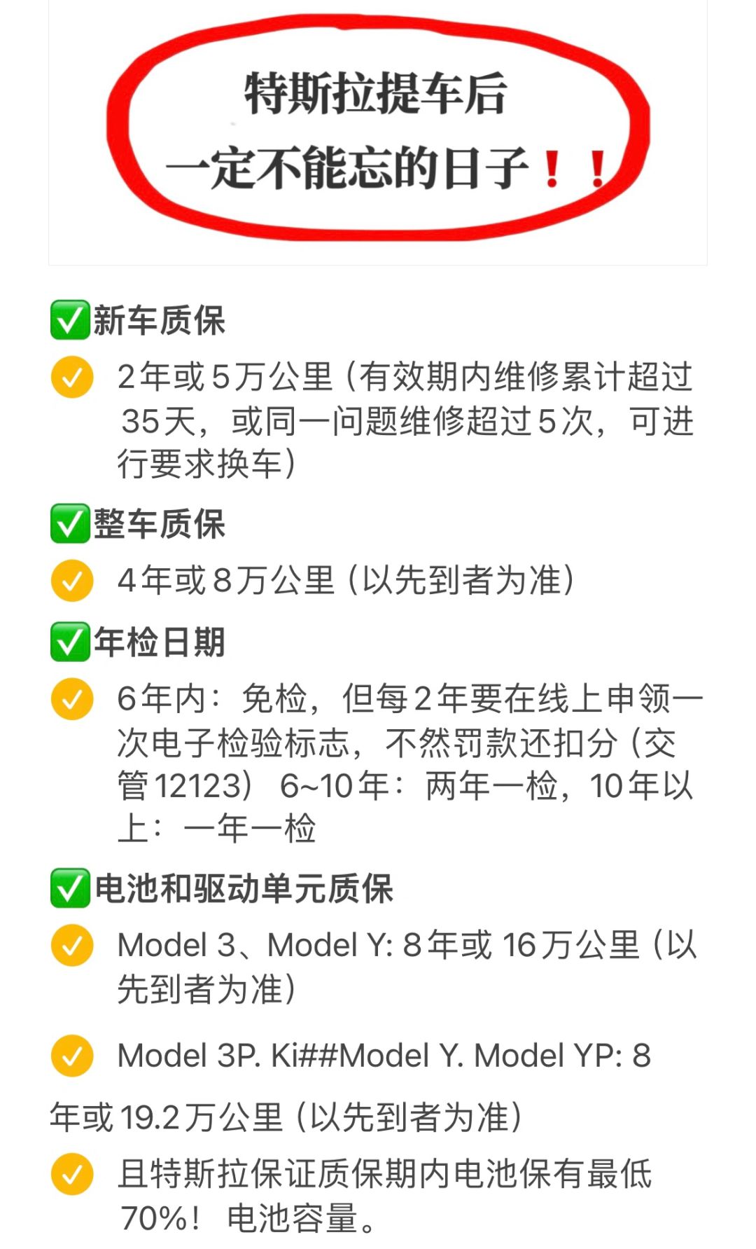 - Model 3P、长续航Model Y、Model YP:8年或19.2万公里(以先到者为准)
