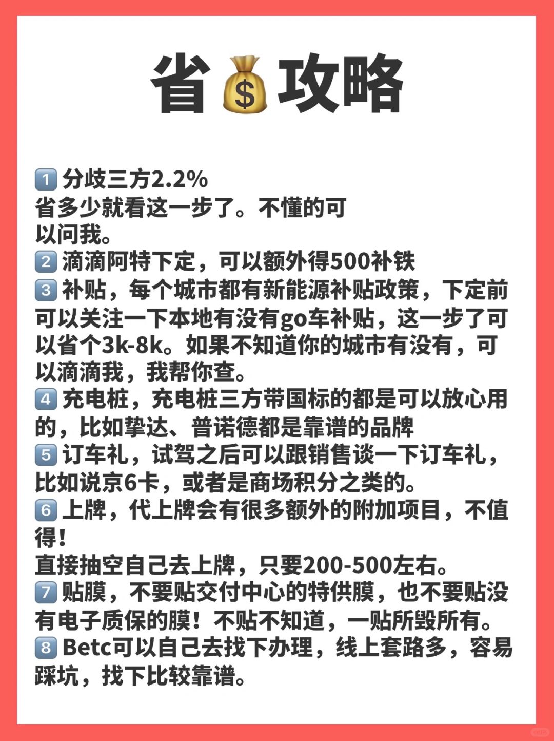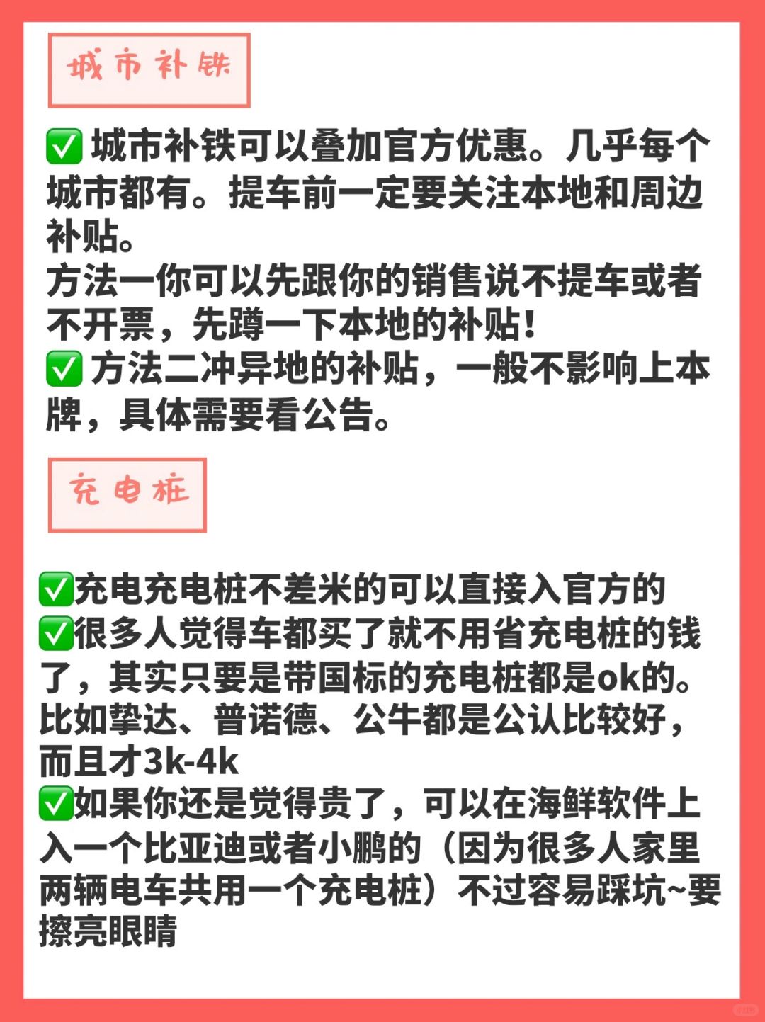 ✅芬7⃣️ guan方粉漆的年fei率**都偏高,不过自己找bank才2.2。 ✅特殊补铁 滴滴小特,下定可返950首,轻松到手。。 蔚来、理想、小鹏、问界、极氪、智己、飞凡**都可以!不限制车型。 ✅补贴 城市补铁可以叠加官方优惠。几乎每个城市都有。提车前一定要关注本地和周边补贴。 🔴方法一你可以先跟你的销售说不提车或者不开票,先蹲一下本地的补贴! 🔴方法二冲异地的补贴,一般不影响上本地牌,具体需要看公告