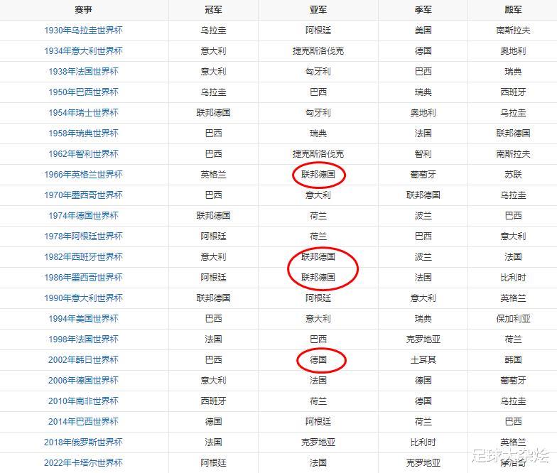 说完冠军,我们来谈谈亚军,德国队是获得亚军次数最多球队4次,阿根廷3次获得亚军。中国队目前参加了1次世界杯正赛(2002韩日世界杯),在小组赛中0:2哥斯达黎加,0:4巴西,0:3土耳其,那时认为这是中国队在世界杯的耻辱时期,现在看来这是顶峰国足!