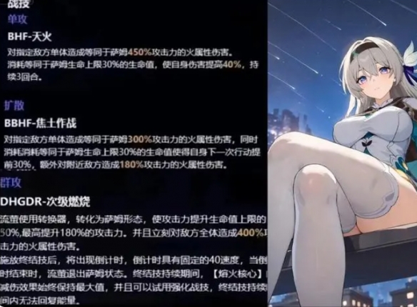 对指定敌方单体造成等同于萨姆450%攻击力的火属性伤害。消耗等同于萨姆生命上限30%的生命值,使自身伤害提高40%,持续3回合。