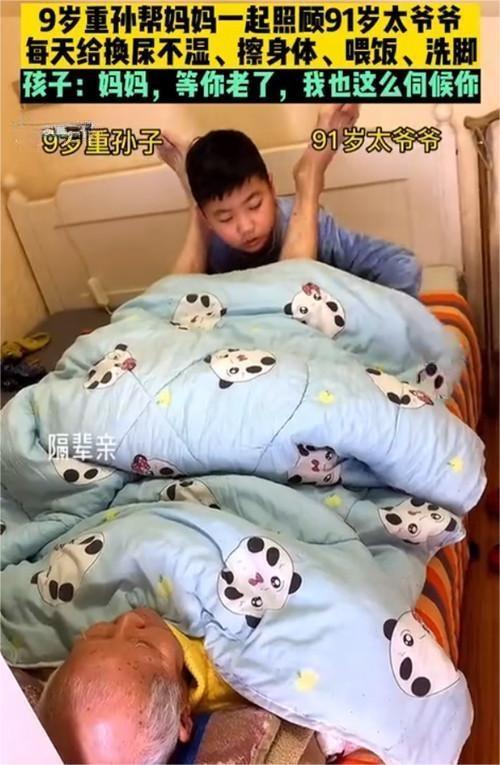 太感动了!河南,孙媳妇半夜三更爬起来给91岁的爷爷换尿不湿,却没想到爷爷说自己害怕,想让孙媳妇抱着自己睡觉。刚开始孙媳妇也觉得别扭,但一想到爷爷一个人可怜巴巴的,她便只好开始尝试去做,一年后却已经习惯了。 (信息来源:弥勒市融媒体中心 ; 隔辈亲!9岁重孙为91岁太爷爷换尿不湿擦身体——中国青年网) 每个人小时候不懂事时,都是父母、爷奶这些长辈们一把屎一把尿给养大的,他们从来都不曾嫌弃孩子们,也不会抱怨照顾孩子有多劳累,只是一心一意的将孩子好好养大。 如今更是如此,在长辈们的悉心照料下,孩子们都长的越来越白嫩,脾气也越来越娇纵,同时,似乎到了需要反哺,照顾家中老人的时候,却显得不怎么乐意了。 都说百善孝为先,又说久病床前无孝子,不过当今社会虽然有不太和谐的声音出现,却也有人在缝缝补补这个破烂的世界,温暖着大家的心。 李女士的丈夫小时候过的苦,因为遭遇变故,小小年纪就失去了父母的照料,是爷爷拖着老胳膊老腿,不辞辛苦将他给带大的,爷爷不仅供他吃穿,还给他提供了上学读书的机会,因此在长大后,他得以顺利找到一份收入可观的工作,还娶了李女士这一漂亮媳妇。 他并没有向李女士隐瞒自己的家庭情况,并表示自己一定会照顾爷爷直到他离开这个世界,对于如此孝顺的男人,李女士只觉得十分满意,就这样,两人在足够了解后便成了婚。 婚后,丈夫也将爷爷接到了两人的新家中,方便自己照顾。在经过了一段和谐又幸福的时光后,李女士为丈夫生育了一个儿子,上有老下有小的丈夫便暗暗下定决心,一定要更努力的工作,挣更多钱,给家人更好的生活。 于是,因为工作的调整,李女士的丈夫开始需要经常出差,一去就是好几天,而家中的一切事务也只好由李女士一人承担了下来。 好在随着孩子的长大,渐渐懂事的他给母亲减少了负担,可91岁的爷爷却因为年龄的增长,渐渐失去了行动能力,不仅视力开始变得模糊,就连大小便都难以控制,日常起居都需要人来照顾。 刚开始李女士多少有点别扭,到底是男女有别,爷爷虽然年纪大了,却也跟自己没有血缘关系,照顾起来实在是有些尴尬,无奈之下她便想着找个人来帮忙。可是对方出的价格实在是昂贵,为了这个家,李女士终于下定决心亲自照顾。 她通过互联网学到了不少照顾老人的办法,买来了尿不湿给爷爷穿上,这样就减少了洗衣服的次数,之后还开始定时给爷爷洗澡,给爷爷收拾的十分得当。 细心如她,每天半夜都会起来一次给爷爷换尿不湿,只是为了不让爷爷因为身体潮湿而不舒服。因为李女士照顾的太过周全,神志不清的爷爷甚至经常会喊她“娘”,错以为是母亲在照顾自己。 有一次半夜里,李女士在给爷爷换完尿布后准备回去休息,可爷爷却满眼泪花的喊害怕,想让李女士陪着自己睡,李女士一时间多少有点接受不了,可再一想,爷爷不过是把自己当成母亲了而已,于是便答应了,从此她便每日陪在爷爷身边,也更加方便照顾了。 后来,她将自己照顾爷爷的视频录制下来发布到了网络上,很多人都感叹家中有这么个好孩子是一件令人羡慕的事,却也有不和谐的声音说觉得不太合乎规矩。 但其实仔细想想,当家中老人真的到了需要自己来照顾的时候,大家真的还有空想什么伦理纲常吗,照顾长辈们本身就已经成了我们应该要做并必须要做的事。 有时候李女士忙碌没时间的时候,年仅9岁的儿子也会去帮爷爷更换尿不湿,一个是小男孩,一个是老小孩,不过都是需要照顾的人罢了。 李女士作为一个孙媳妇能做到这种地步,着实令人敬佩,不过能让她无怨无悔如此付出,相信爷爷当年对她也跟自己孙子一样疼爱,李女士的丈夫也一定是个合格的好丈夫。 #MCN首发激励计划#