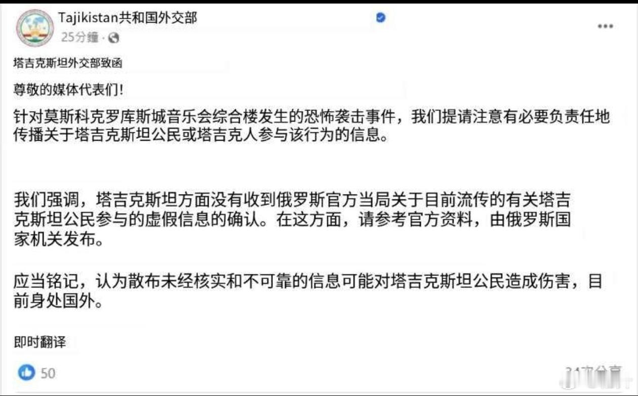 先是有俄媒传出来有4个被捕嫌疑人是塔吉克人…然后又有塔吉克斯坦官方的否认…