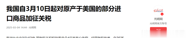 原文登载于中国青年网 2025年3月04日 关于“我国自3月10日起对原产于美国的部分进口商品加征关税”的报道