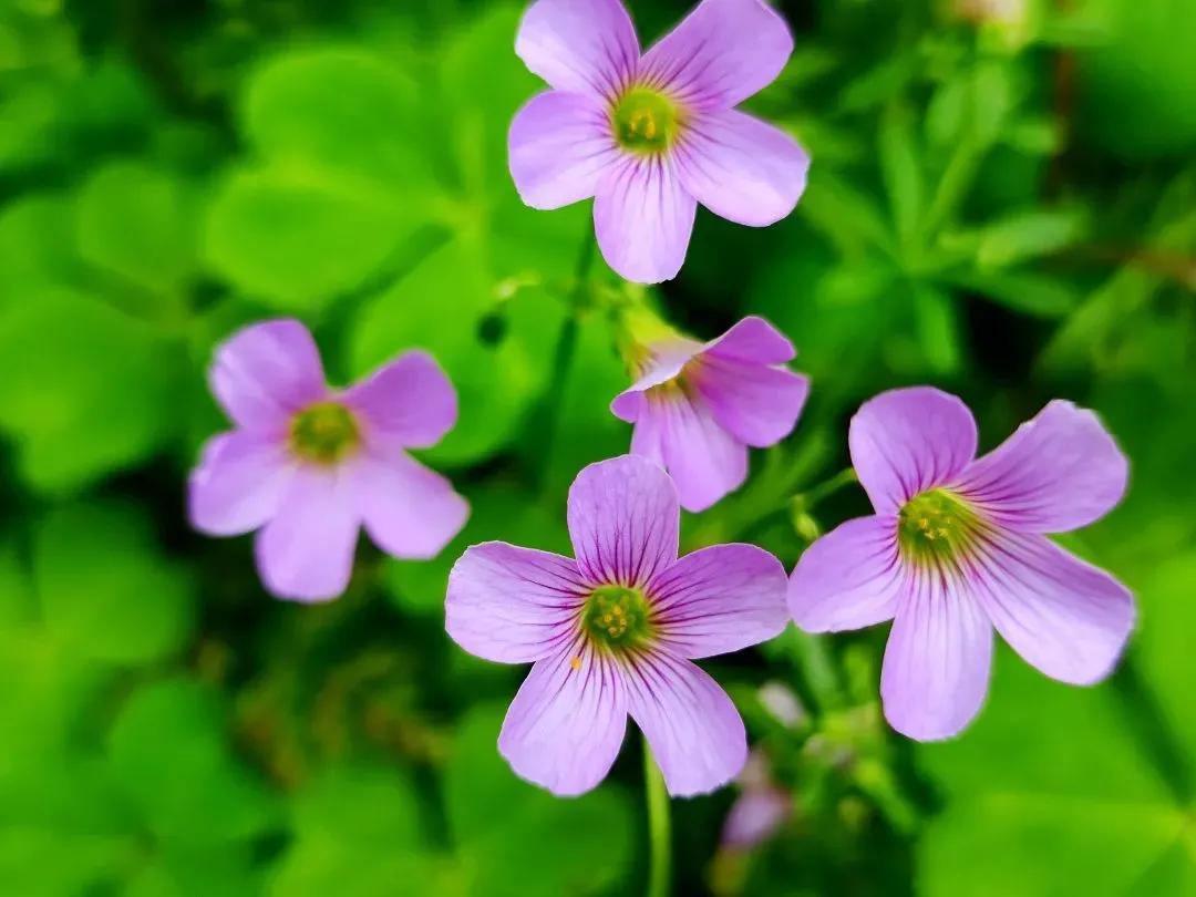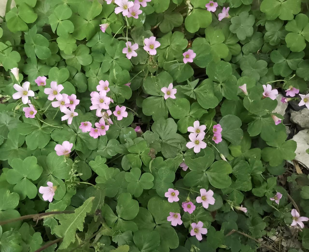 今天的美: 今天的美,来自红花酢cù浆草。 小区门口有一小片红花酢浆草,叶子茂密青翠,小花繁多可爱。虽然植株低矮,却生命力顽强。花期也极长,能从三月份开到十一月份。 每片叶子由三片心形叶片构成。偶尔能有四片的,就是传说中的四叶草啦。茎叶咀嚼起来有酸味,所以叫酢(醋)浆草。 花朵紫红,靠近花心有红色条纹。而且它只在太阳下开花,一遇上阴雨天,它就收拢花瓣耷拉着“休息”。也 许正是由于它晴天“上班”阴天“休业”,张弛有度,才能有那么长的花期吧。