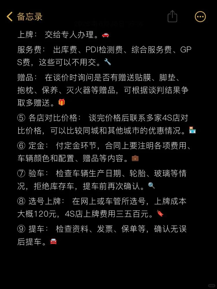 赠品: 在谈价时询问是否有赠送贴膜、脚垫、抱枕、保养、灭火器等赠品,可根据谈判结果争取多赠送。🎁