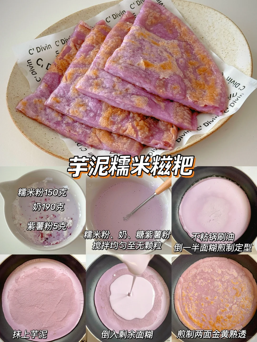🌈一口平底锅就可以搞定的糯米糍粑,软糯拉丝,外焦里嫩,香甜可口,做法也敲简单,绝对一口就沦陷~ ✅蔓越莓糯米糍粑 ✅黑芝麻糯米糍粑 ✅抹茶红豆糍粑 ✅芋泥糯米糍粑 ✅菠萝糯米糍粑 ✅红糖糯米糍粑 详细做法可以参考图片哦 ❤️记得要小火煎至完全定型翻面煎至表面金黄熟透 ❤️糖的量可以根据自己的喜好酌情加减哦