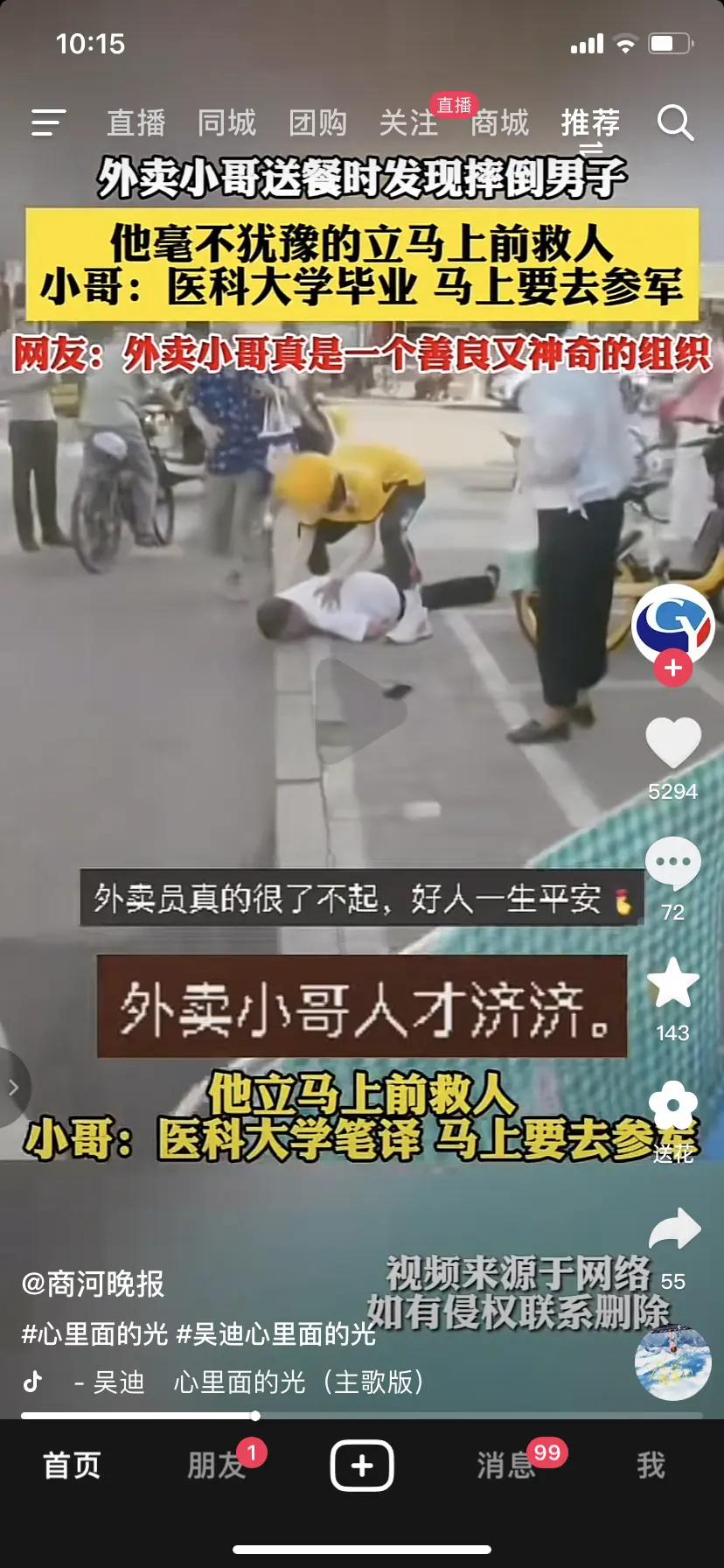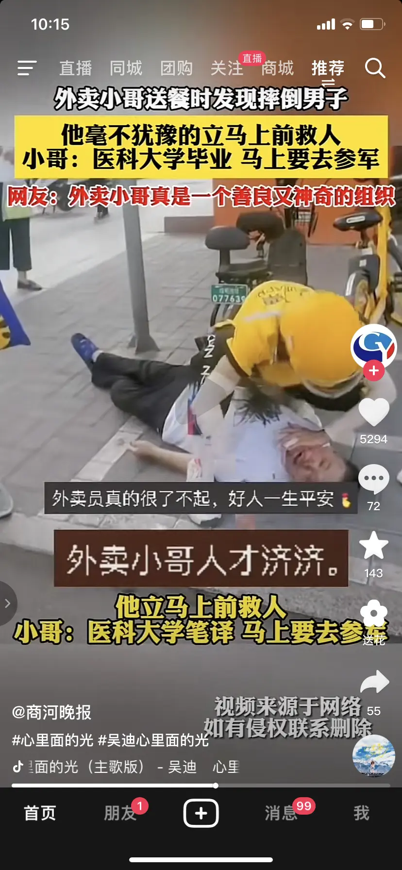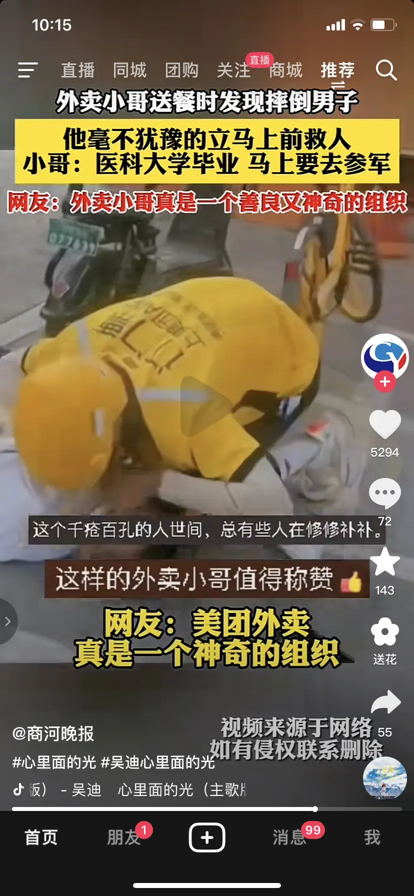 外卖小哥看到男子摔倒,毫不犹豫上前救人,为你点赞