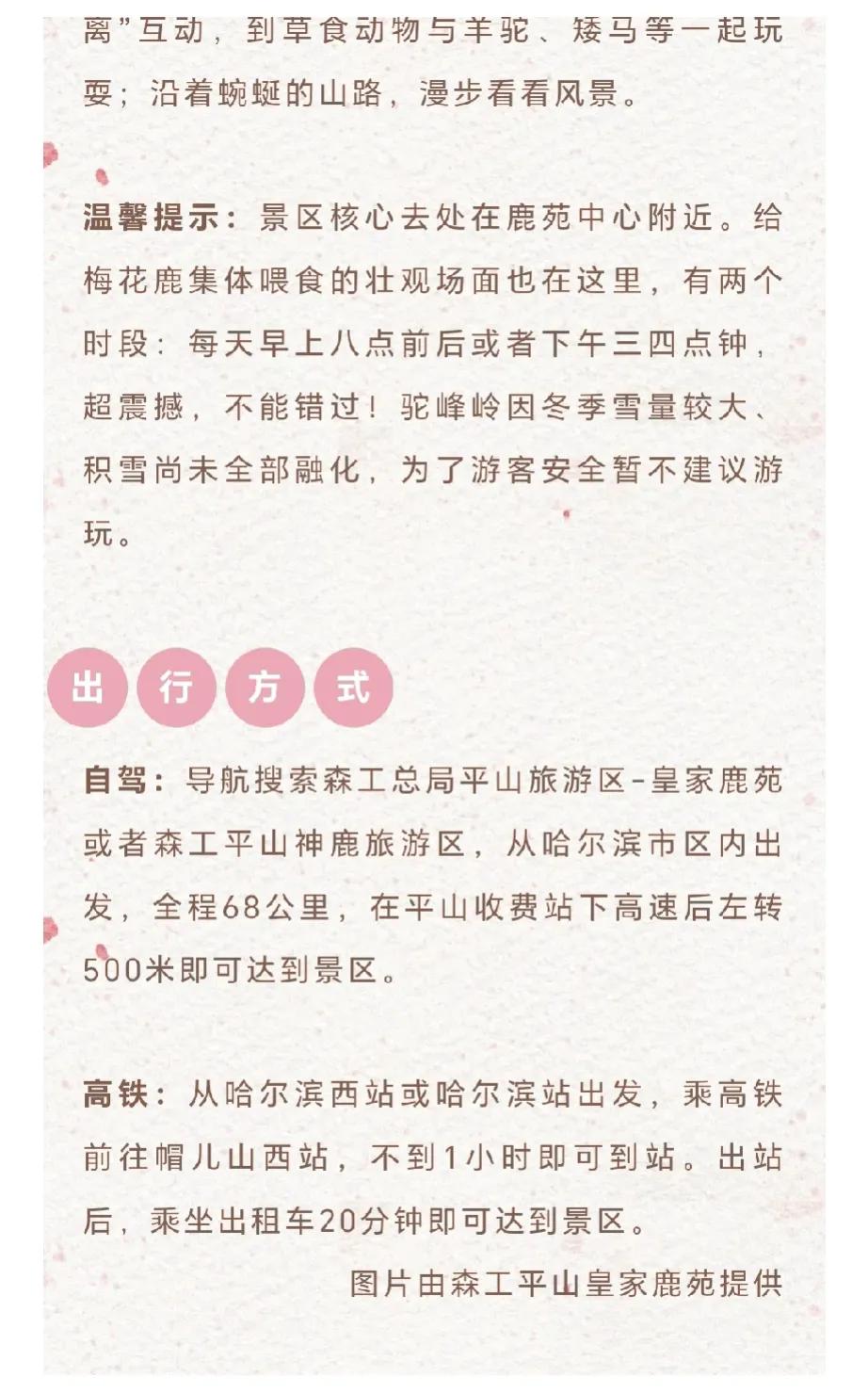 哈尔滨这个景区开园了,清明小长假带上家人来吧![赞][赞][赞] 皇家鹿苑4月4号开园 这里森林动植物资源丰富 800多年前就是金国皇家狩猎场 这里适合遛娃 带着一家老小一起来感受春天吧 景区八点半开园 五点闭园 现场可以购票 “龙江森工平山林旅资讯”公众号也可以购票!#春日生活打卡季#
