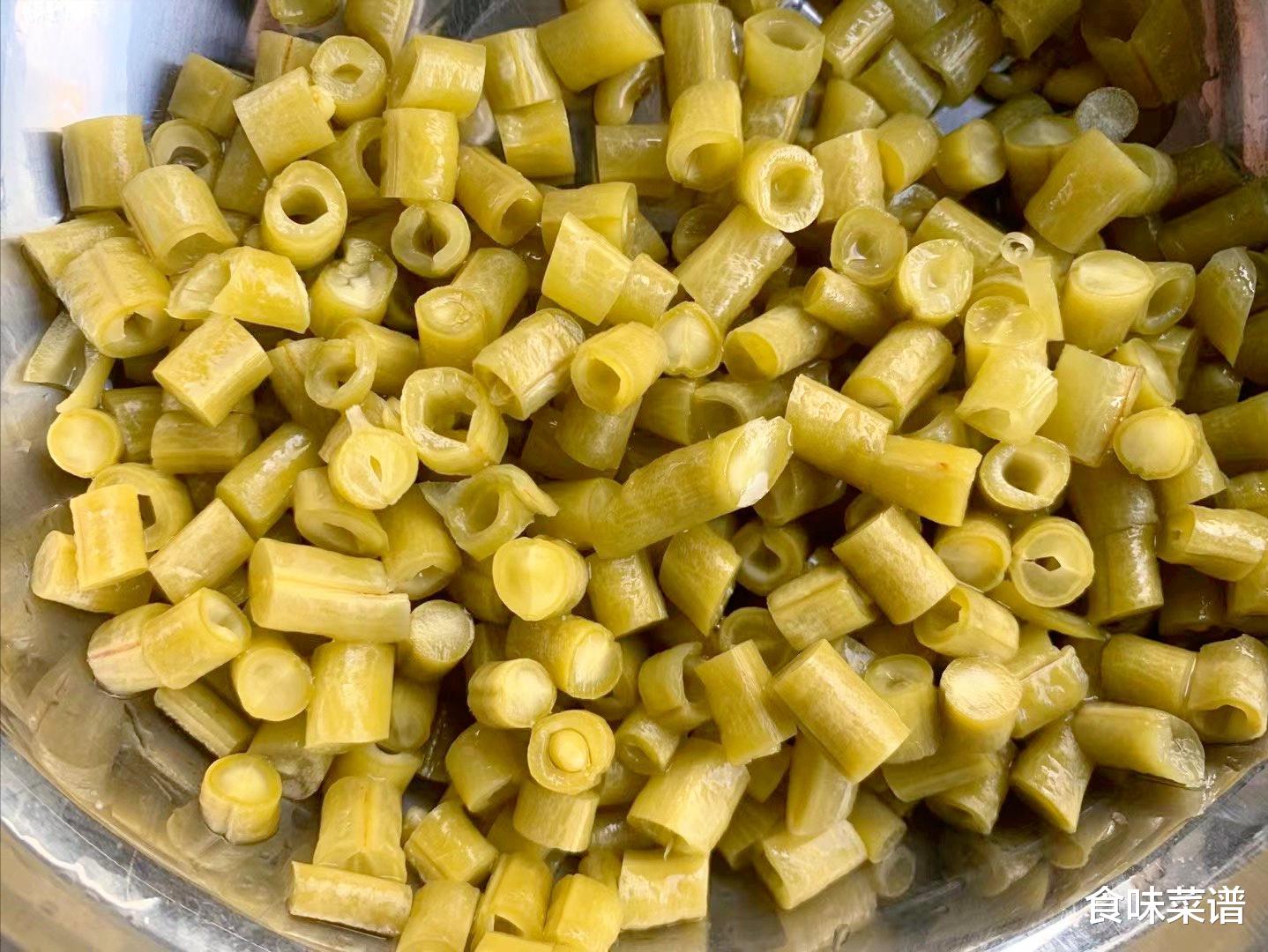 1、准备一袋酸豆角,自己腌的最好,酸豆角清脆爽口,开胃解腻,怎么做都好吃,尽量多洗几次,豆角清洗干净以后,控干水分,改刀切成碎末,放在一边备用。