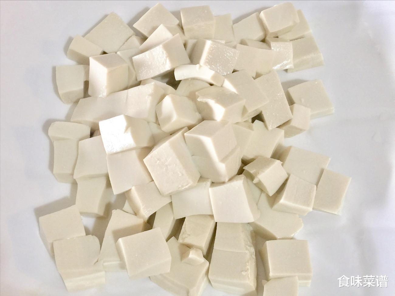 1、准备一斤豆腐,改刀切成小块,起锅烧水,水开倒入豆腐丁,用大火煮2分钟左右,捞出过一遍凉水,控干水分备用。