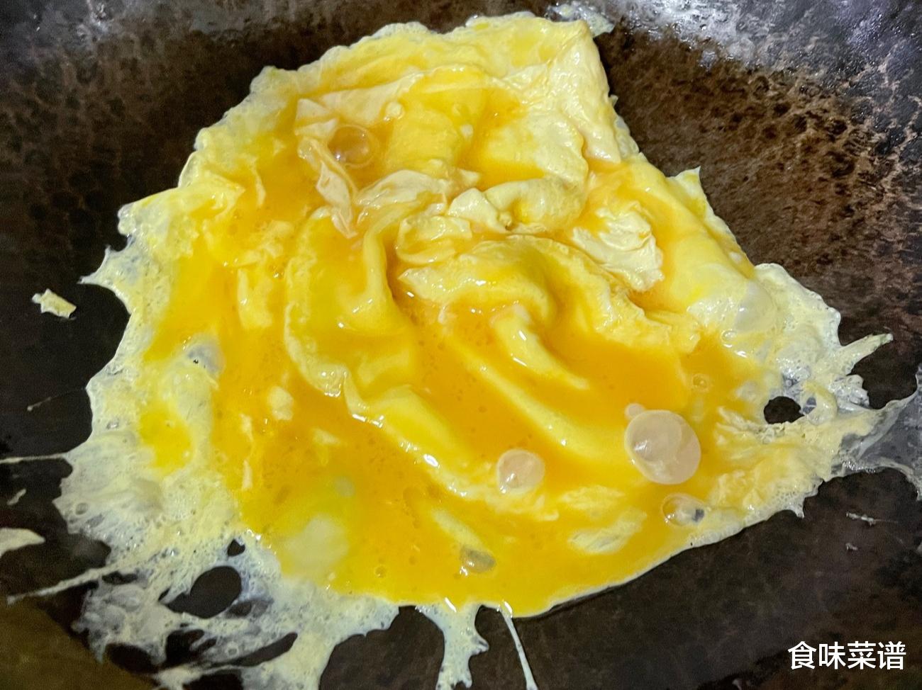 1、碗中打入3个鸡蛋,加入1克食盐码味,少许的白醋去腥,搅拌均匀,起锅烧油,油热倒入鸡蛋液,轻轻晃动锅底,炒至定型,炒香炒熟后,先盛出锅留着备用。