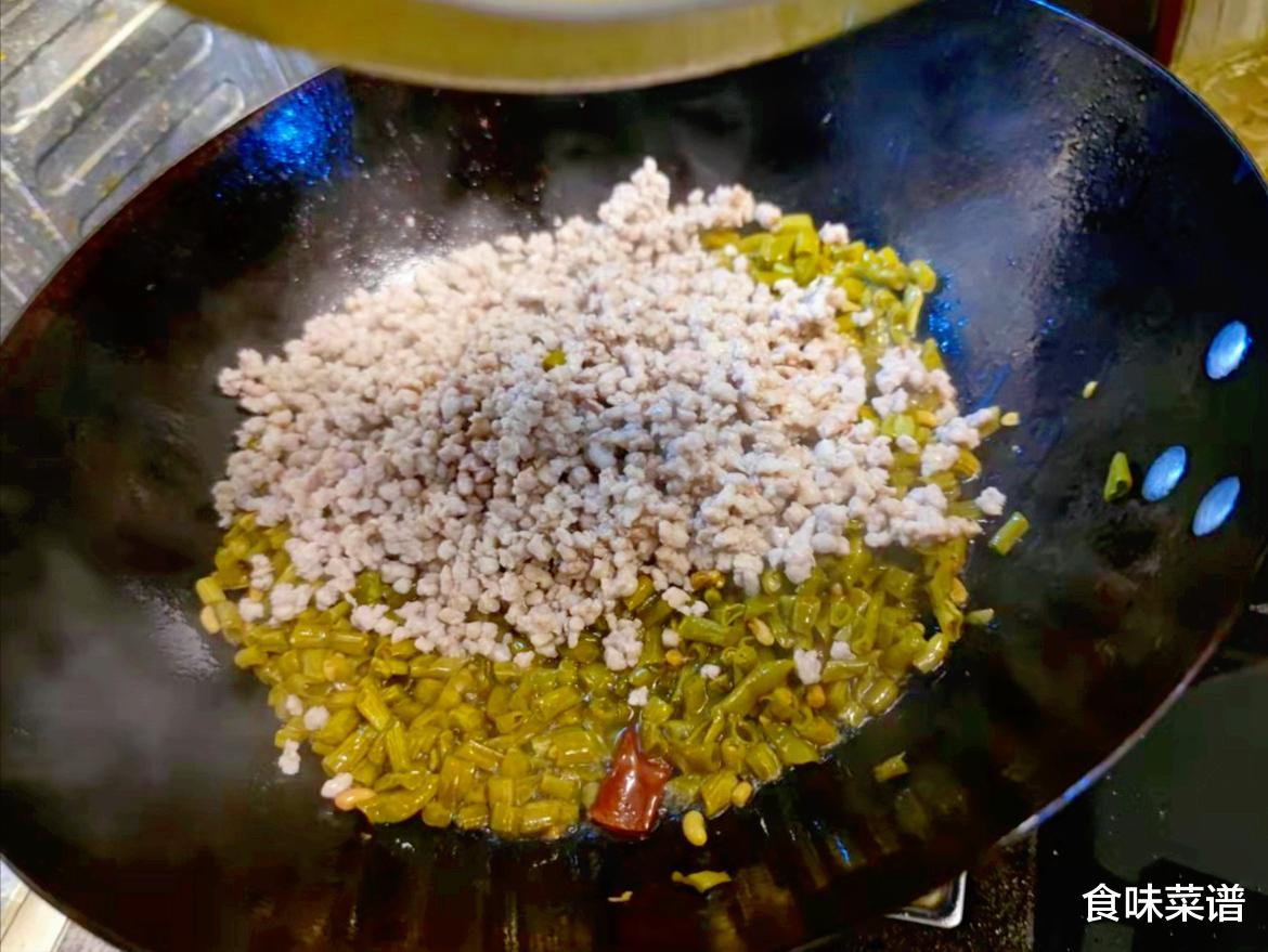 3、按照这个方式炒的酸豆角肉末,酸香美味, 爽脆开胃,下饭太带劲了,一碗米饭舀入3勺酸豆角,拌匀即可开吃,大快朵颐,毫无压力,喜欢吃辣的可多放辣椒。