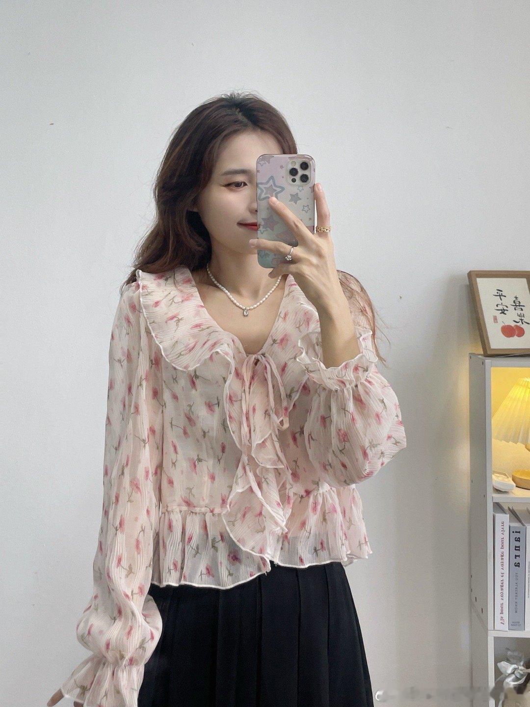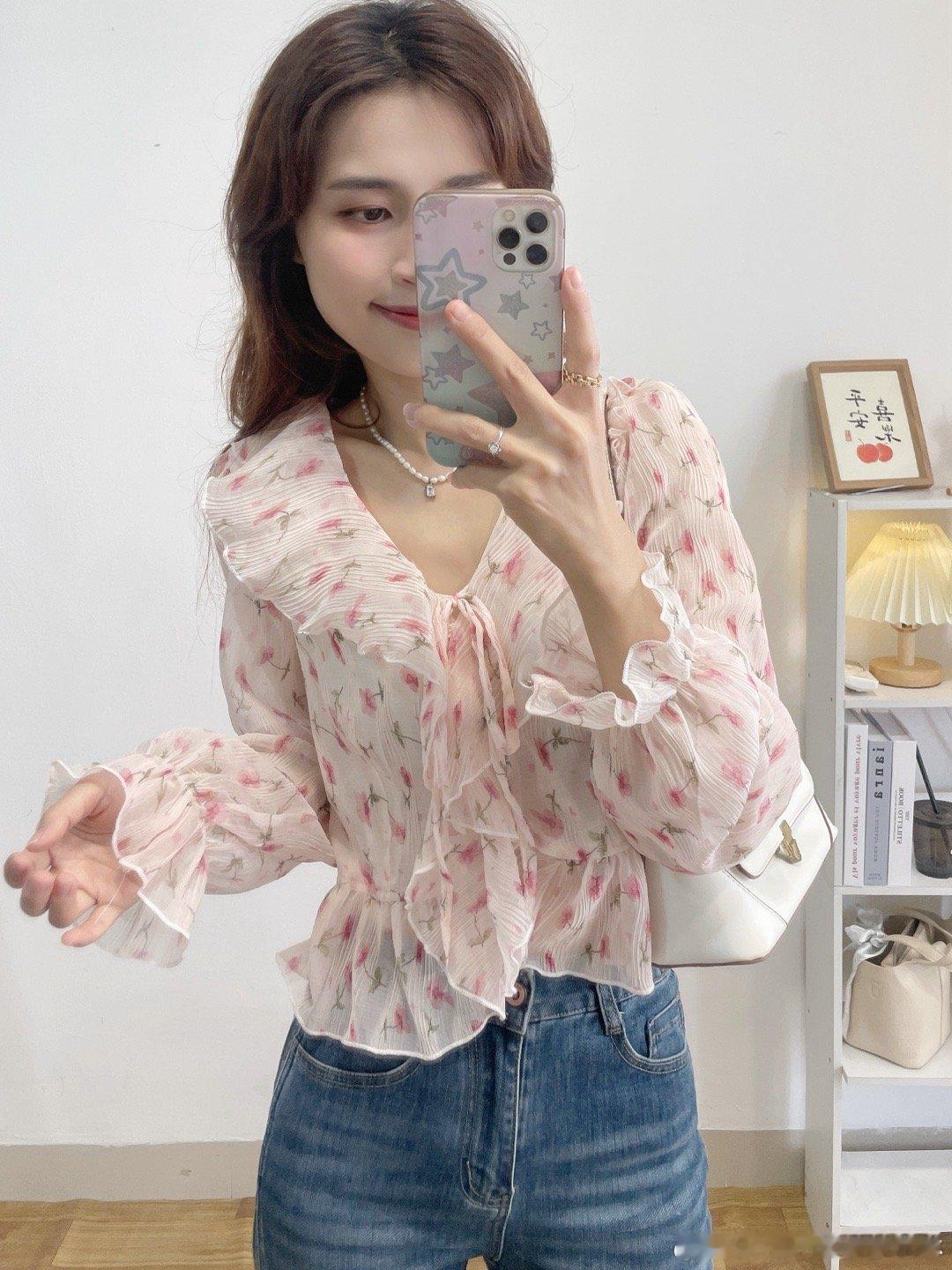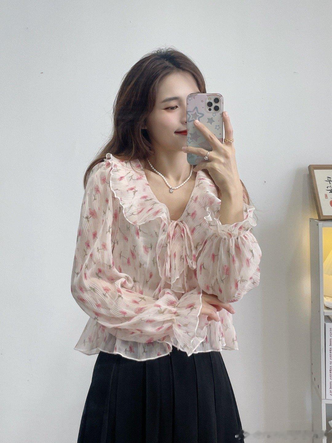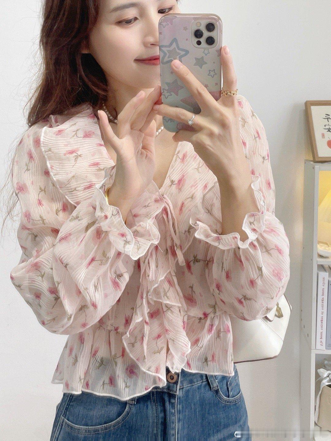 粉粉嫩嫩的碎花上衣,雪纺面料,很轻飘,夏天也可以穿的面料哦!