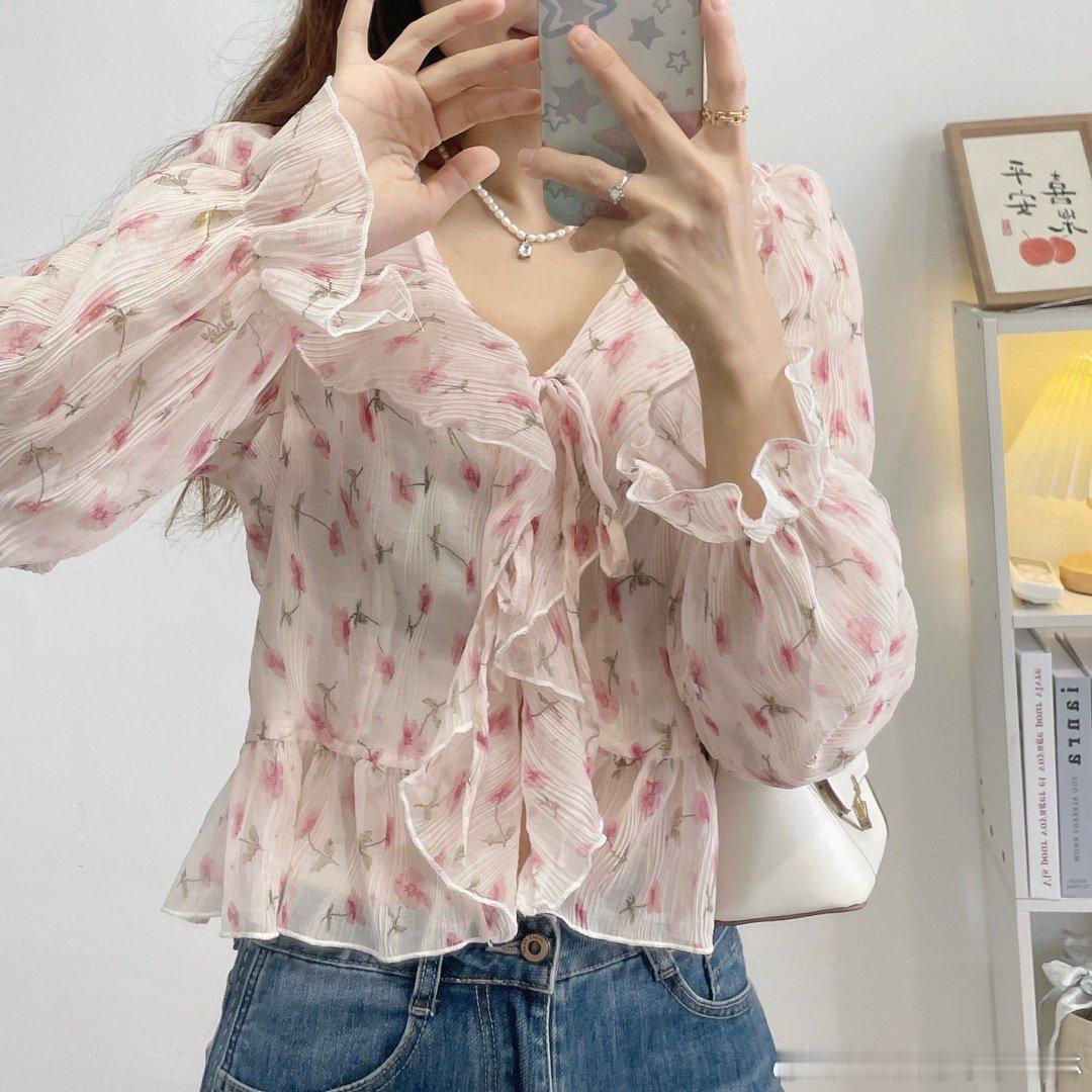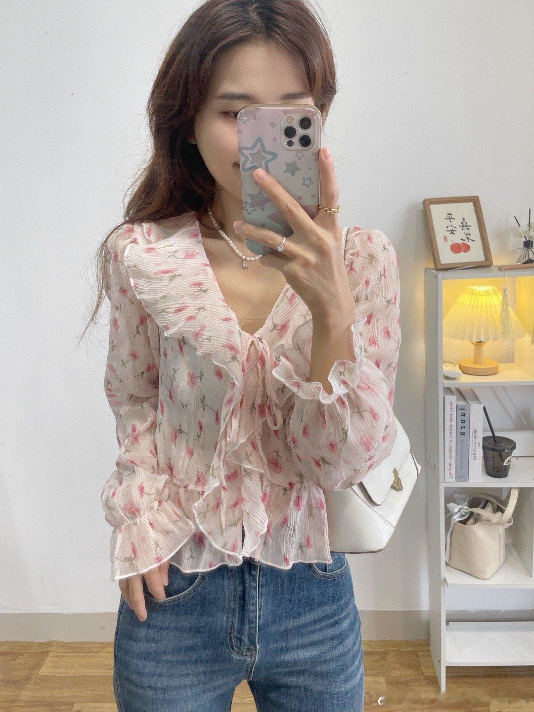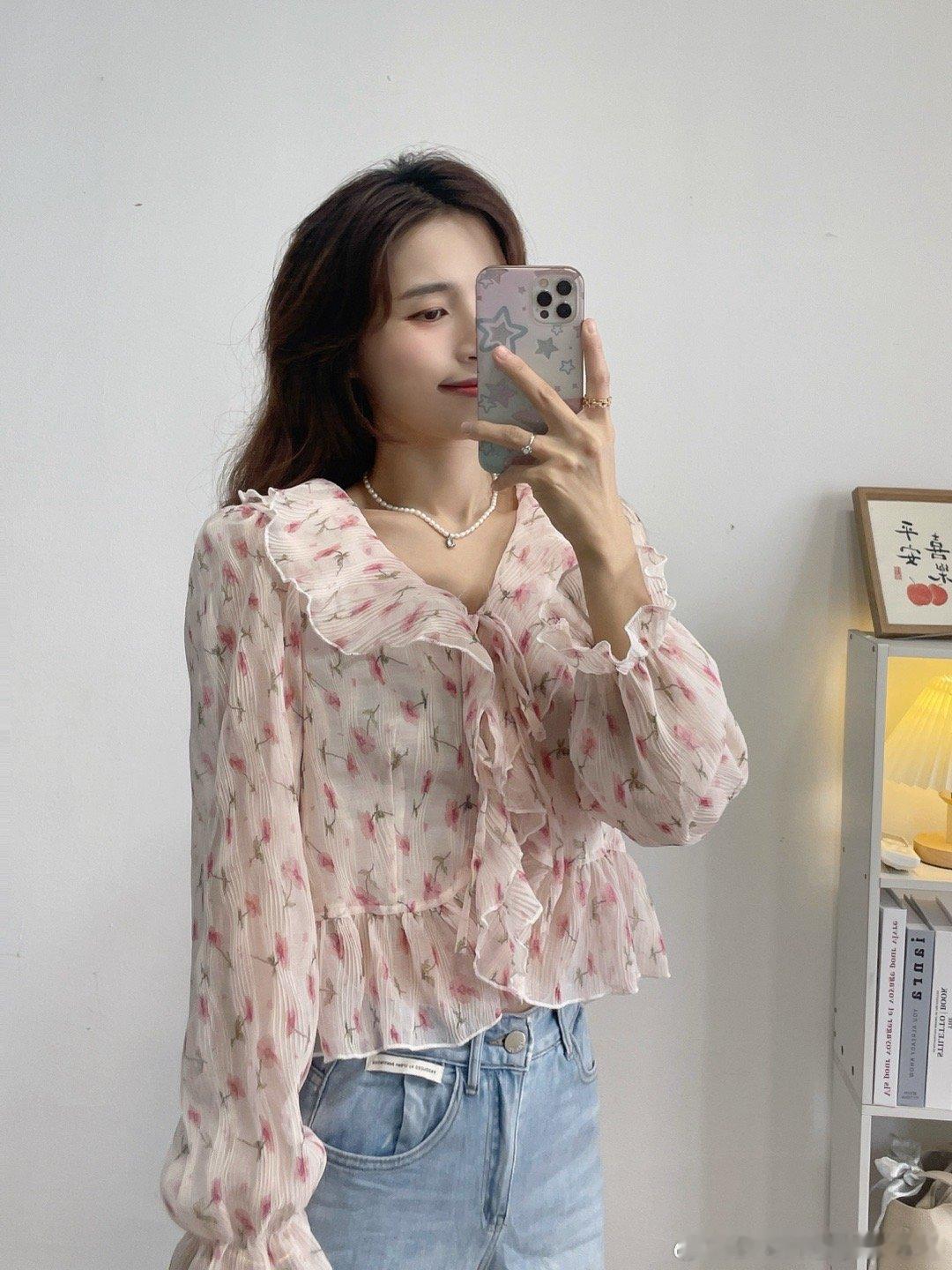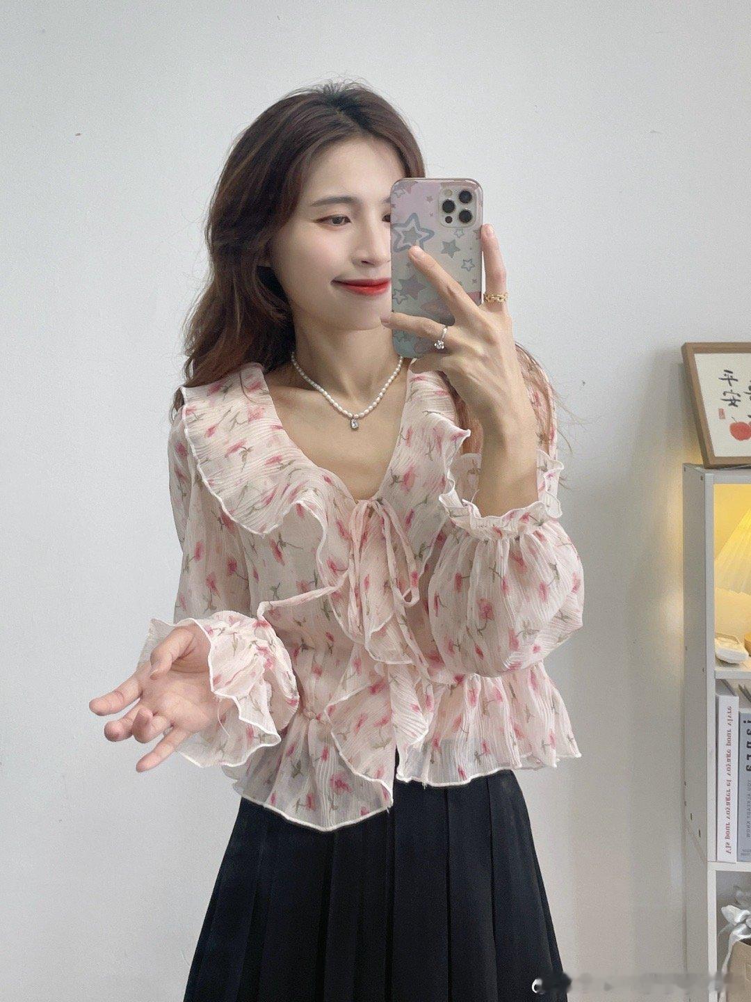 粉粉嫩嫩的碎花上衣,雪纺面料,很轻飘,夏天也可以穿的面料哦!