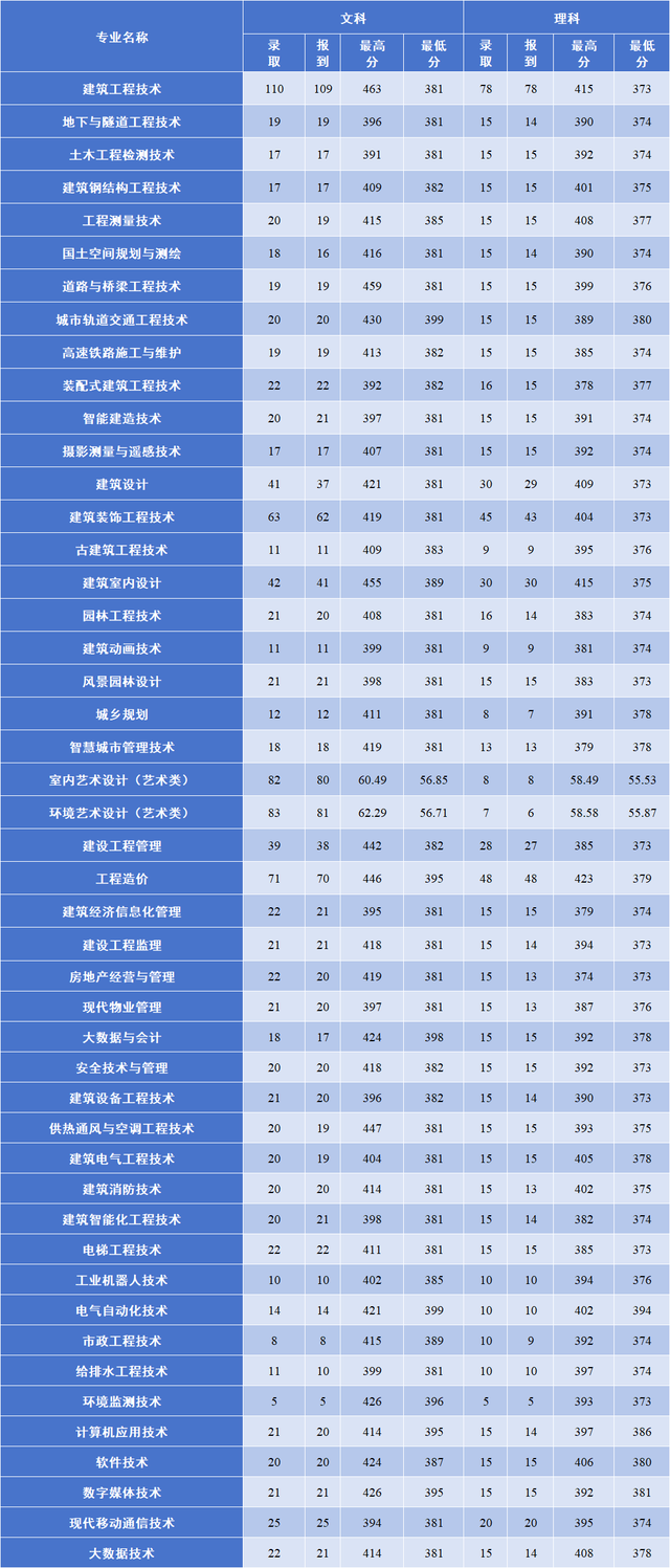 从录取数据来看,该校2022年文科录取专业中城市轨道交通工程技术、工程造价、电气自动化技术、计算机应用技术等专业最低录取分相对较高,工程造价、电气自动化技术、计算机应用技术等理科招生专业最低录取分相对较高。