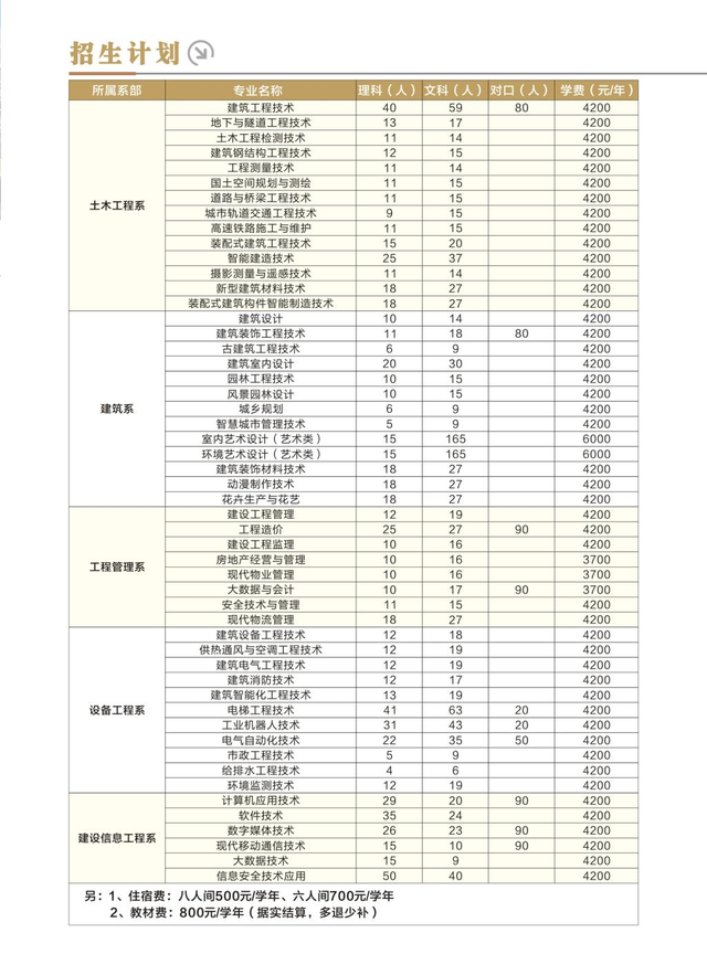 公开信息显示,该校设有土木工程系、工程管理系、建筑系、设备工程系、建设信息工程系、思想政治教育教学部、基础教育部、文艺体育部8个教学单位,开设建筑工程技术、工程造价、建筑装饰工程技术等48个专业,涵盖土木建筑、资源环境安全、交通运输等7个专业大类。具体都有哪些专业,我们可以看下2024年普通专科招生计划: