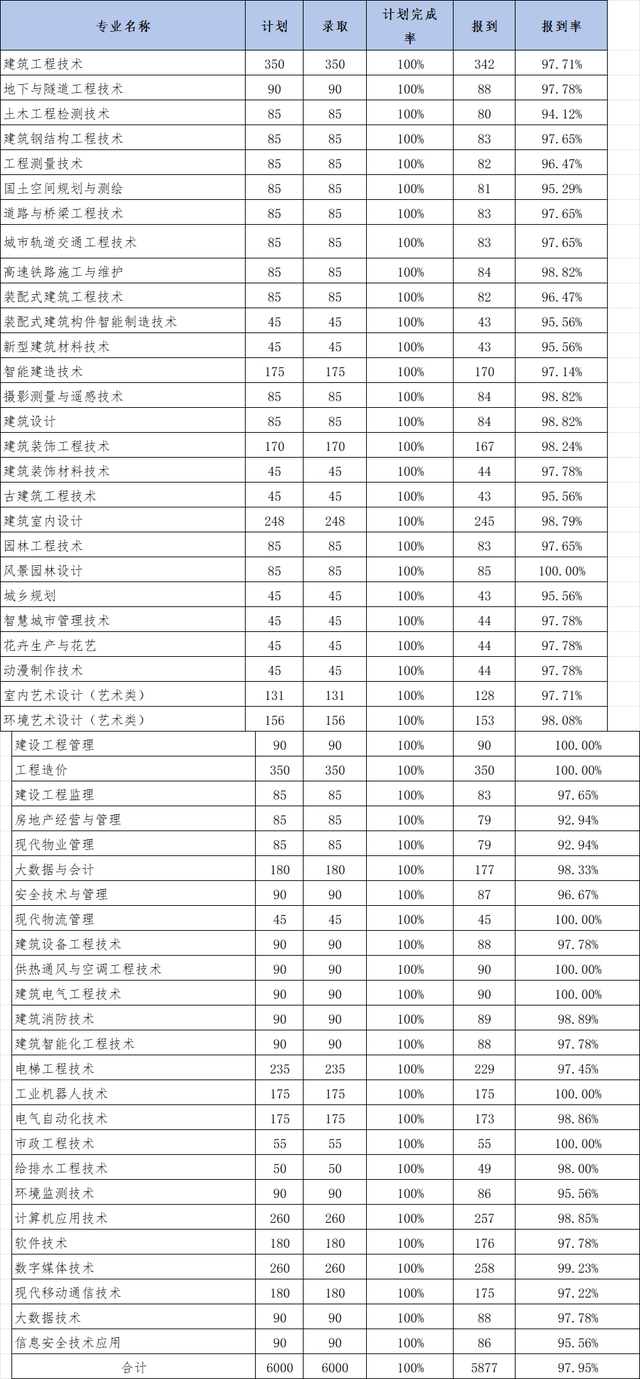 根据该校2024年度高等职业教育质量年度报告,2024年招生计划为6000 人,计划完成率 100%,报到率 97.95%。另外单招录取 3090 人,报到率 98.70%;对口录取 700 人,实际报到 691 人,报到率 98.71%;理科录取 846 人,报到率 96.93%;文科录取 1364 人,报到率 96.48%。2024 年河南建筑职业技术学院分专业录取报到统计表如下: