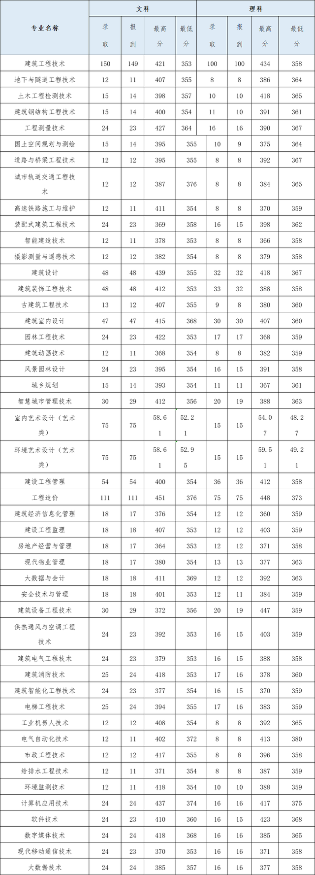 从上表可知,2023年统招录取考生中,文科城市轨道交通工程技术、工程造价、大数据与会计、电气自动化技术、环境监测技术、计算机应用技术、数字媒体技术等专业分数相对较高;理科城市轨道交通工程技术、电气自动化技术、计算机应用技术、软件技术、数字媒体技术等专业分数相对较高。需要注意的是,这里的高是相对的,只是在本校分专业录取最低分对比中高一些。