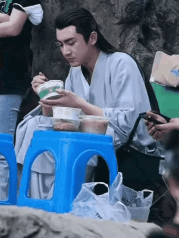 林更新有自己的房车,但他仍然选择坐小板凳吃饭,很低调也很随和。