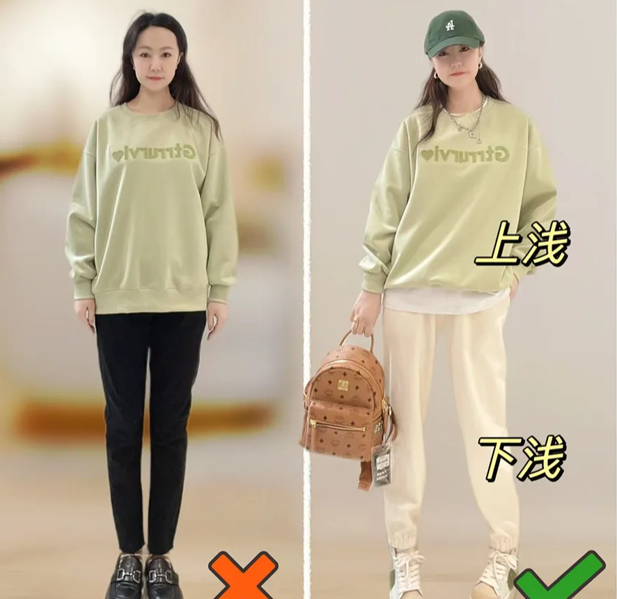 按照“上宽下窄”搭配方式,也会有人去尝试卫衣搭配紧身裤或打底裤,以为这样着装符合要求必然好看,事实上,这种黑色的紧身裤是非常挑人的裤子,对腿型条件要求很高,腿不够细和直,配色宽松的卫衣或针织衫,都难掩土气感,显腿粗还没有精气神。