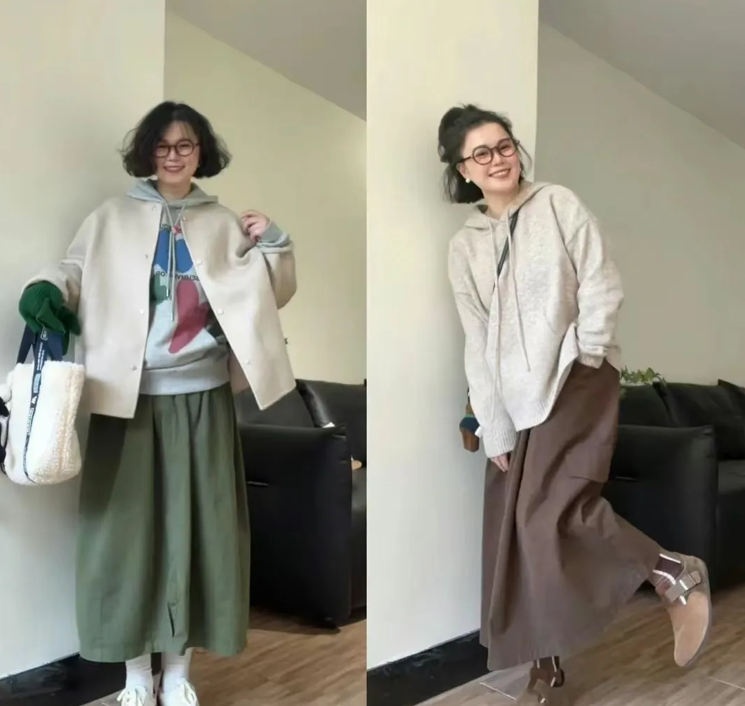 建议大家可以像上海阿姨这样,用卫衣搭配裙子,摆脱常规的裤子穿搭思路,用裙子的飘逸灵动来弱化卫衣的休闲运动风,展现出更为洋气的一面。