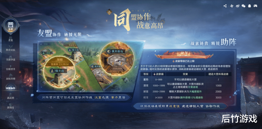 “友盟协作”玩法中,同阵营盟友自发结队,协同作战支援无阻。超过180人的20级同盟还能激活AI机制,通过积累战意值建造精锐大营,战场局势瞬间风云变幻,比单调的传统SLG玩法刺激太多。