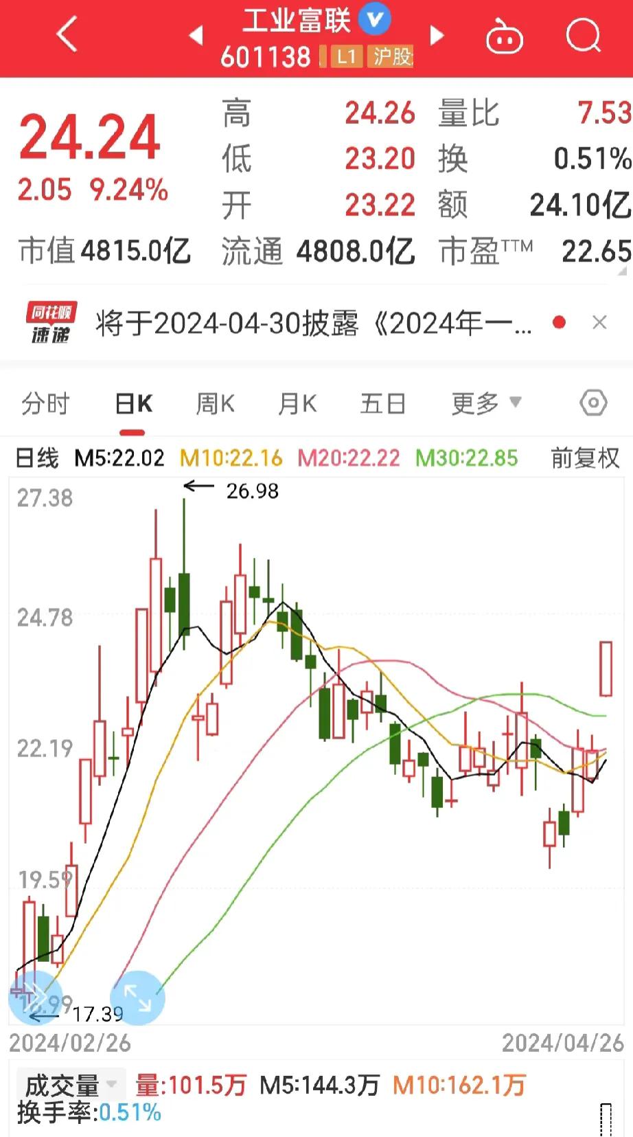 加油啊! 今早股市,一直盯着工业富联,开盘就接近5个点, 我就在想今天可能会秒板, 20分钟过去了,依旧没有板上, 耐心的等待吧! 终于可以回本了! 看好你哟! 持股等涨! #股市分析# #分享股市好消息# #股市开心事分享# #分享股市喜悦#