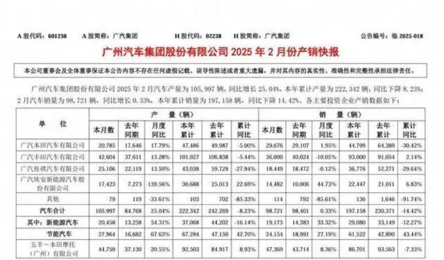 广汽集团最新销售报告显示,2月份集团整体汽车销量达到9.87万辆。具体来看,广汽埃安(包括昊铂品牌)表现突出,单月售出14482辆,较去年同期大幅增长44.73%。相比之下,广汽传祺的销量略有下滑,2月份共卖出18449辆,同比下降0.12%。