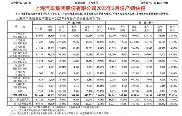 上汽集团在2月份的销售表现持续改善,呈现出强劲的增长态势。当月总销量达到294,942辆,同比大幅增长41.9%,环比也上升了11.7%,创下了近三年同期的最佳增速。具体来看,上汽乘用车贡献了45,599辆的销量,智己汽车售出1,135辆,而名爵汽车在印度市场的销量为4,002辆。整体来看,上汽集团的产销情况在2月份进一步巩固了向好的趋势。