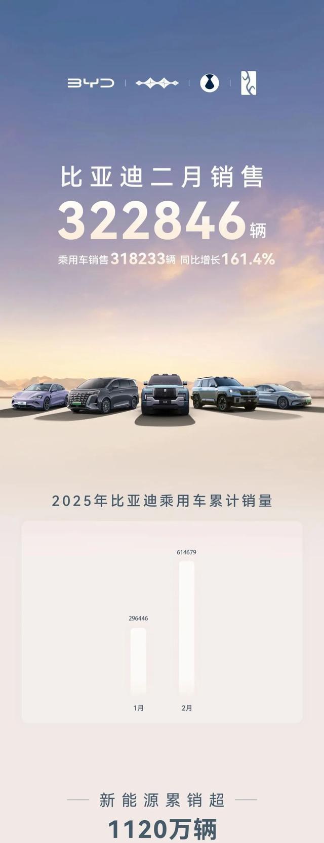 比亚迪最新发布的销售数据显示,公司2月份在中国新能源汽车市场继续保持领先地位,总销量达到32万辆。具体来看,乘用车销售业绩尤为突出,共售出318233辆,与去年同期相比,大幅增长了161.4%。这一成绩不仅巩固了比亚迪的市场领导地位,也反映出中国新能源汽车市场的持续繁荣。