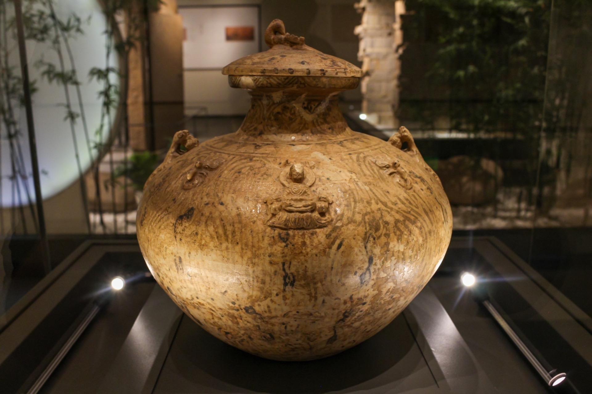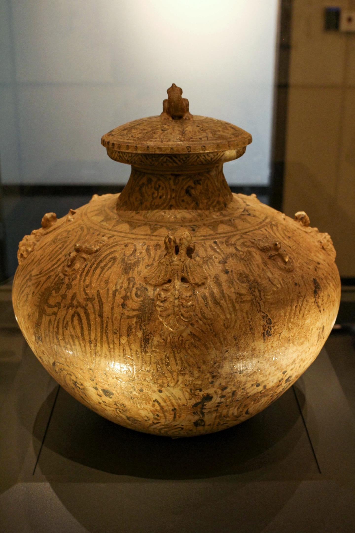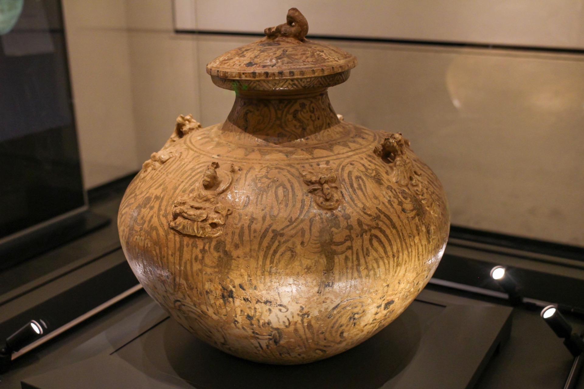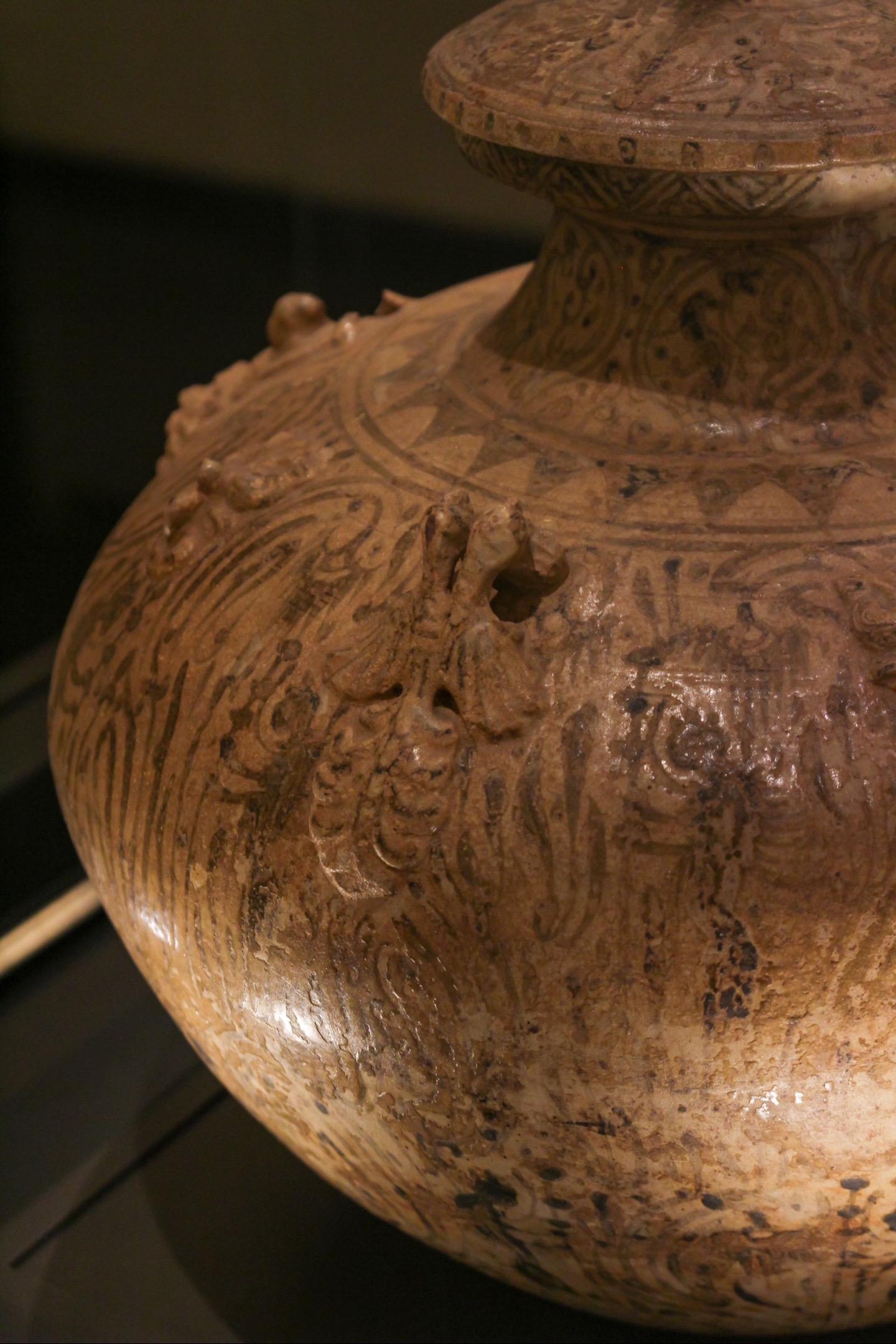 南京六朝博物馆· 青瓷釉下彩羽人纹盘口壶。青瓷釉下彩羽人纹盘口壶,1983年出土于南京市雨花台区长岗村5号三国吴墓,第三批禁止出国(境)展览文物,现藏于南京六朝博物馆。