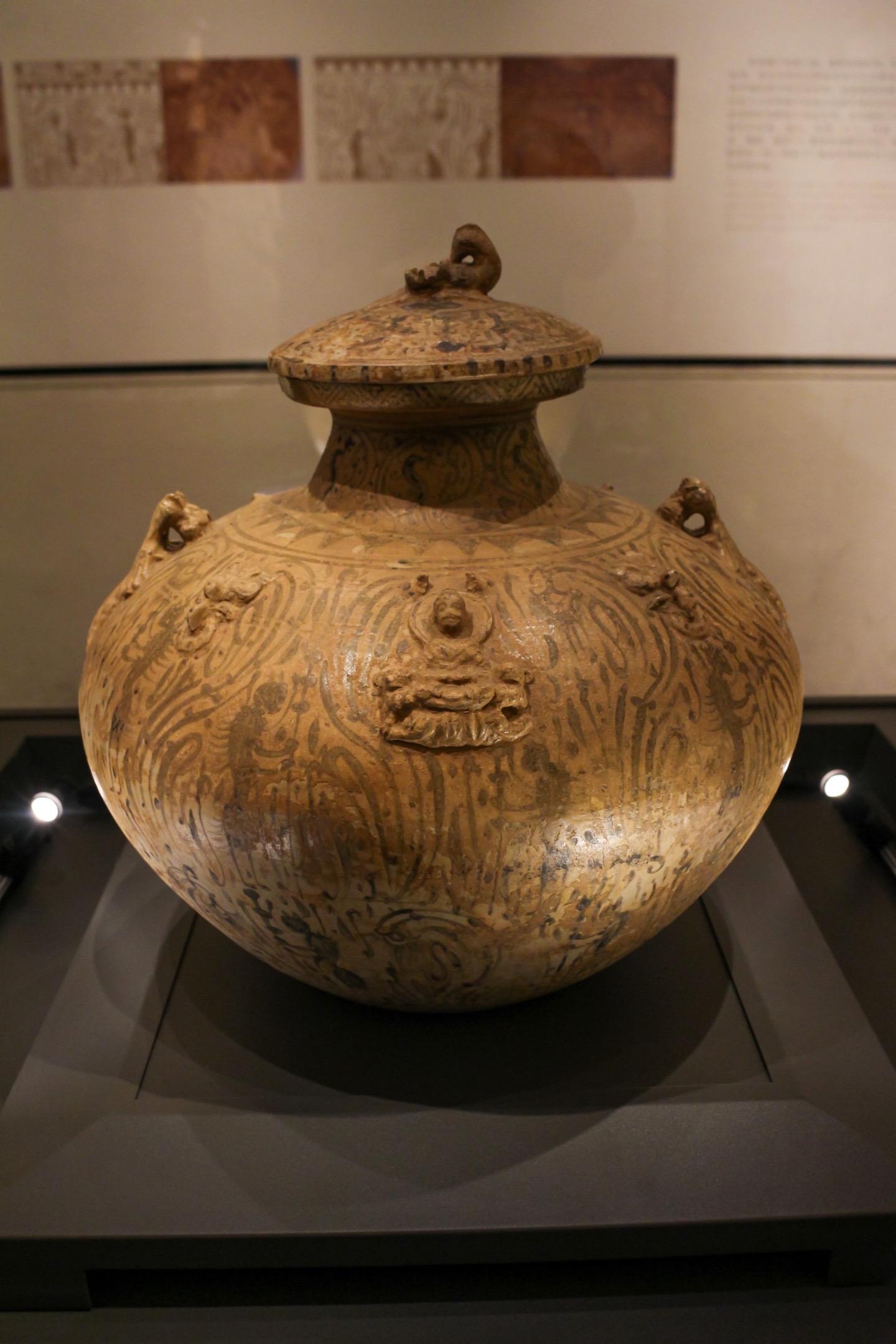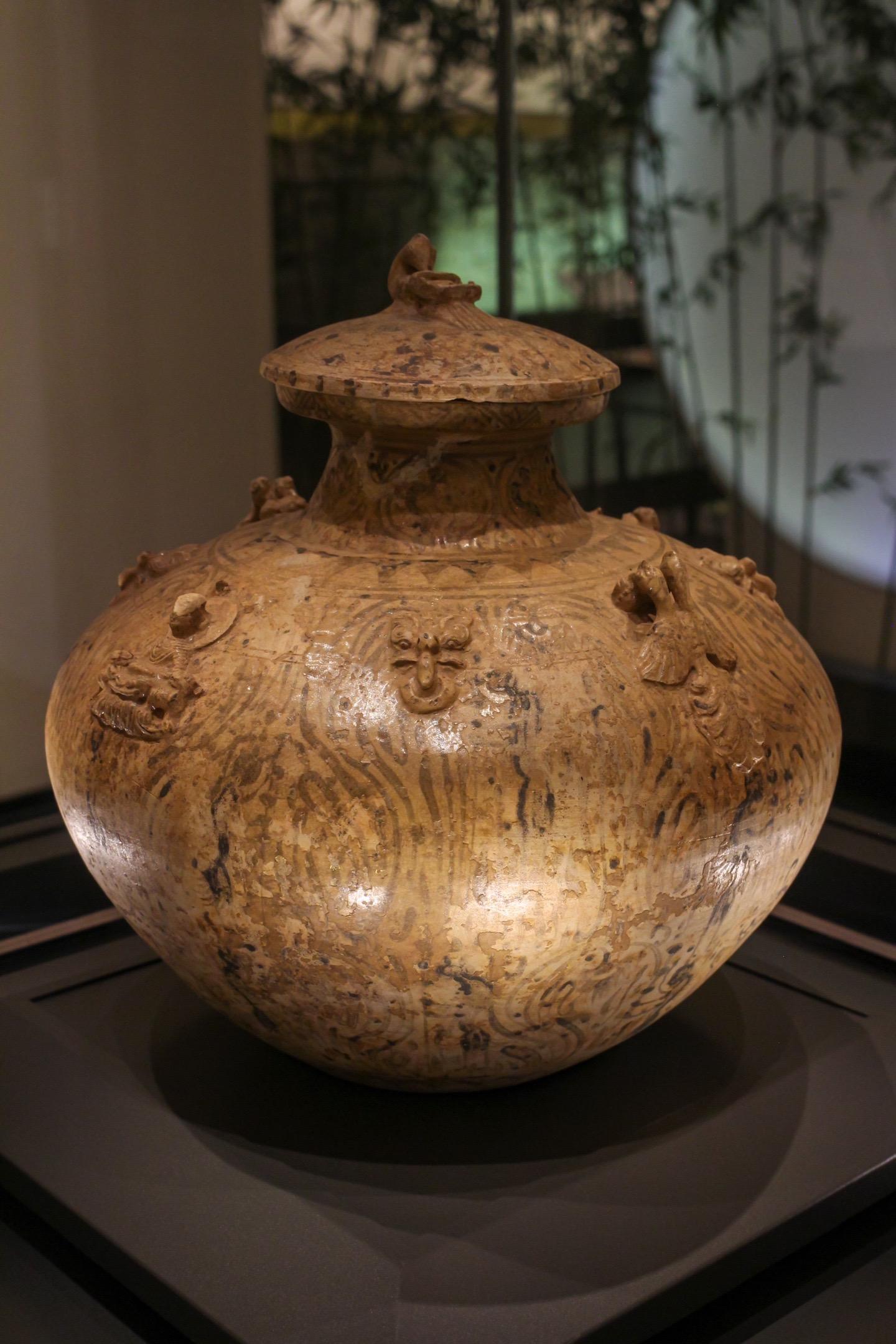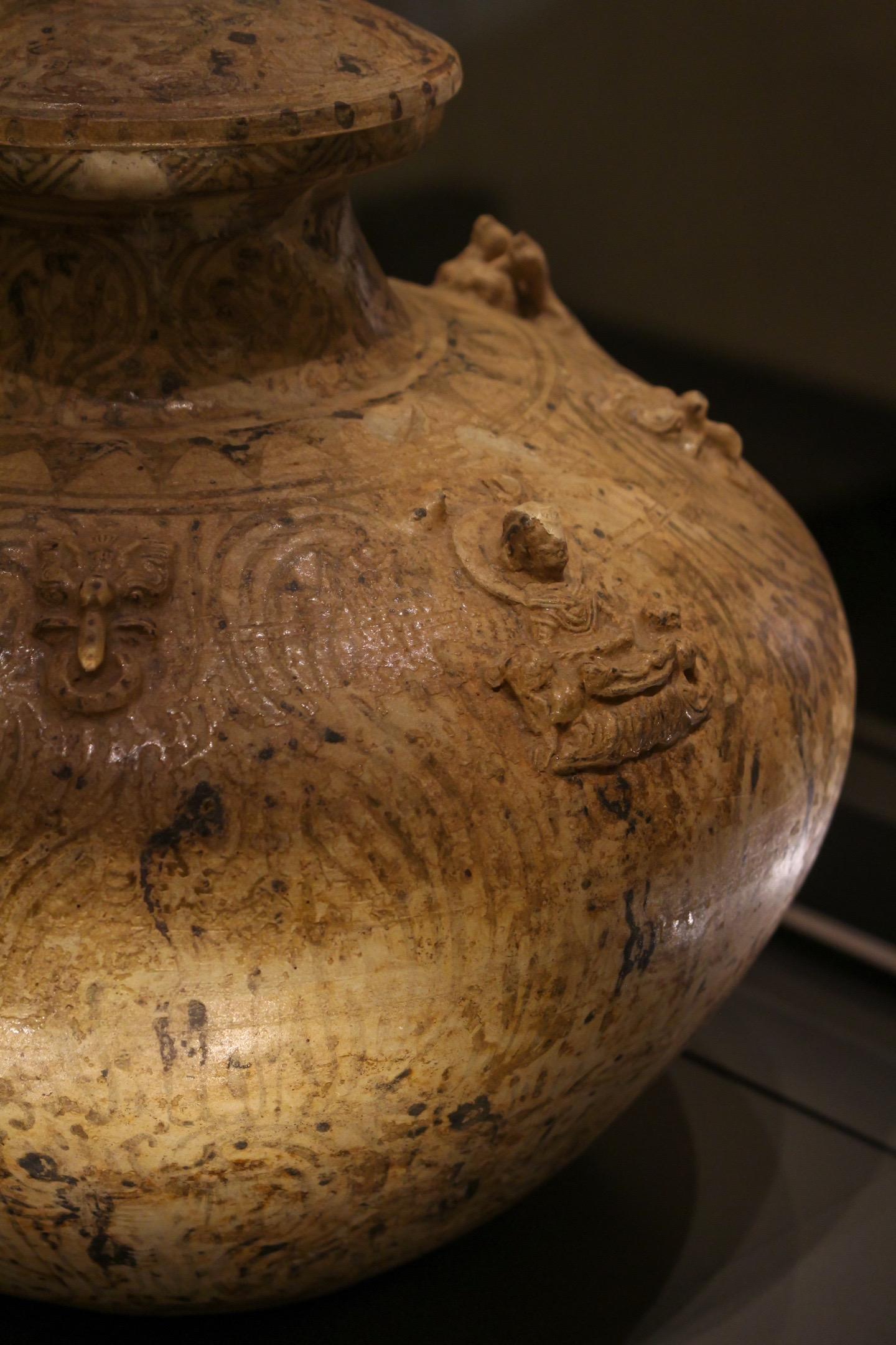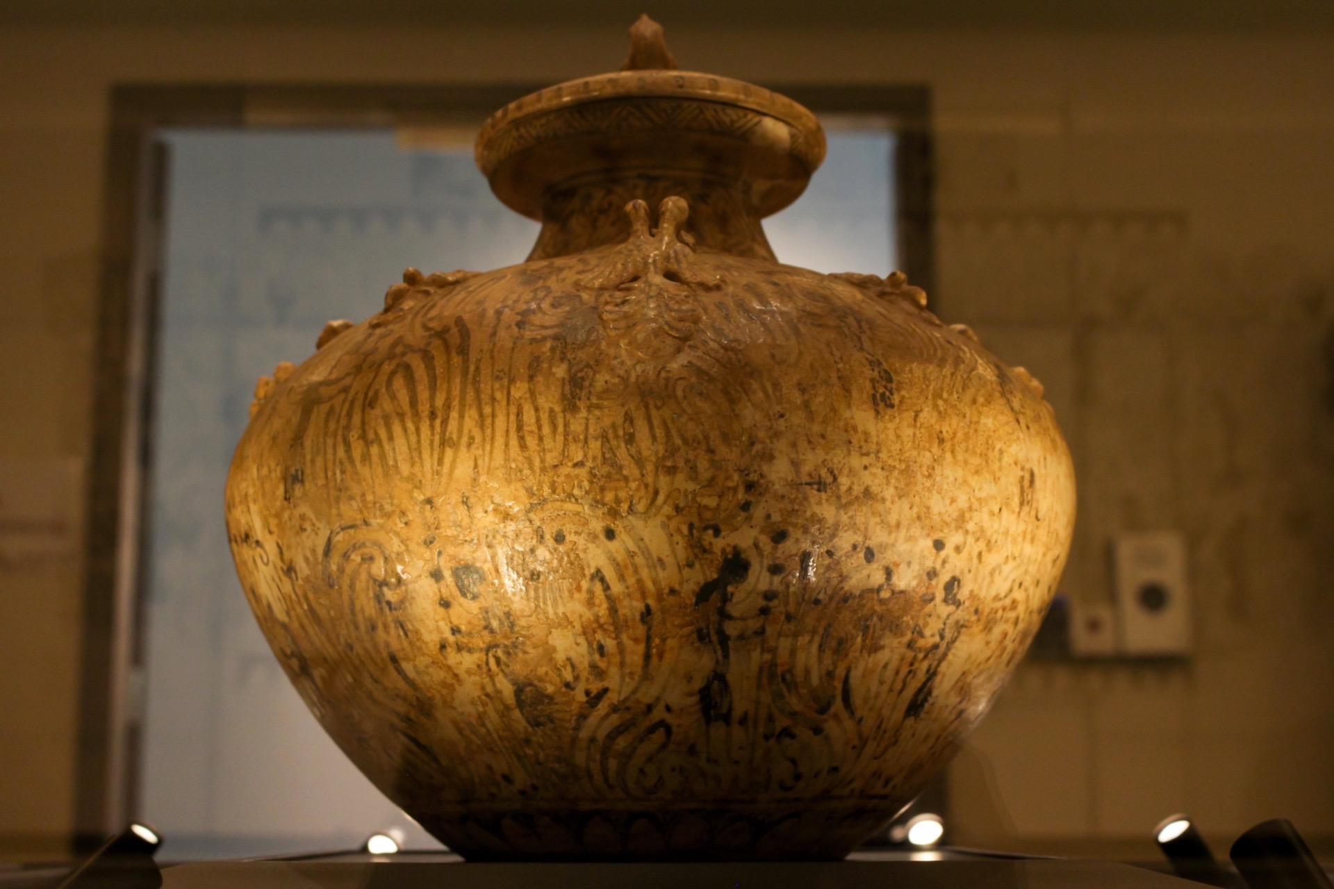 南京六朝博物馆· 青瓷釉下彩羽人纹盘口壶。青瓷釉下彩羽人纹盘口壶,1983年出土于南京市雨花台区长岗村5号三国吴墓,第三批禁止出国(境)展览文物,现藏于南京六朝博物馆。
